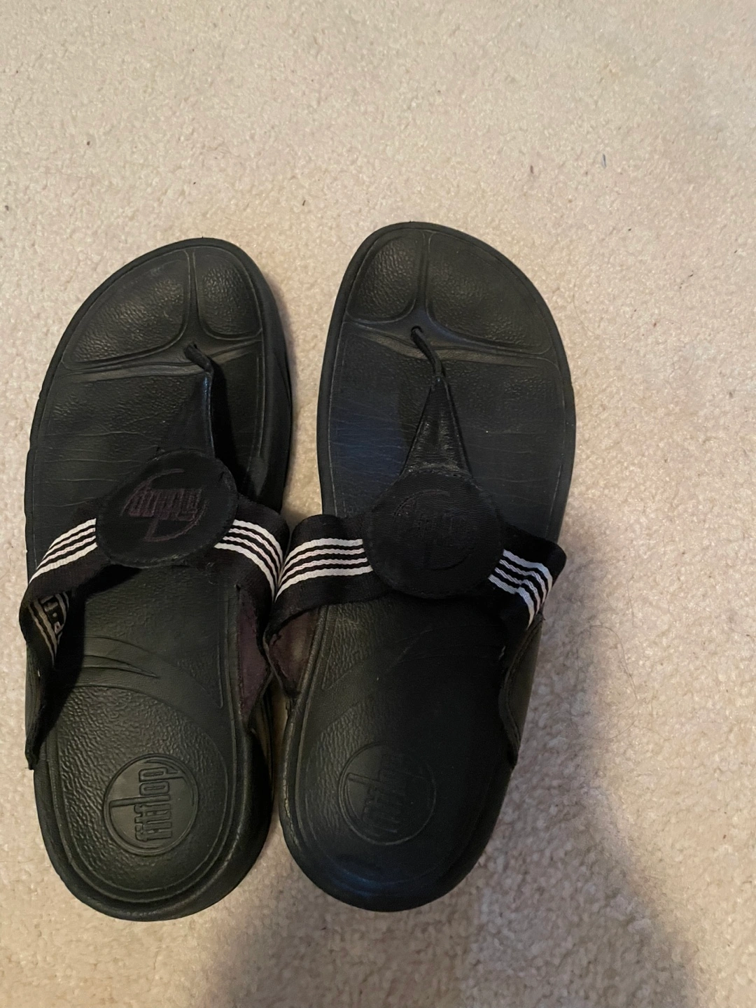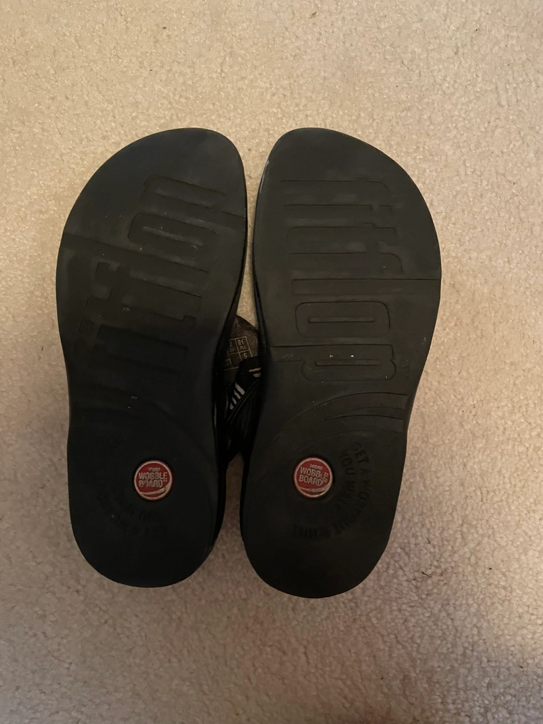 These black Fitflop sandals are in good condition and ready for a new home. They are a US size 8. These sandals feature a 'wobble board' sole, which is designed for comfort and support