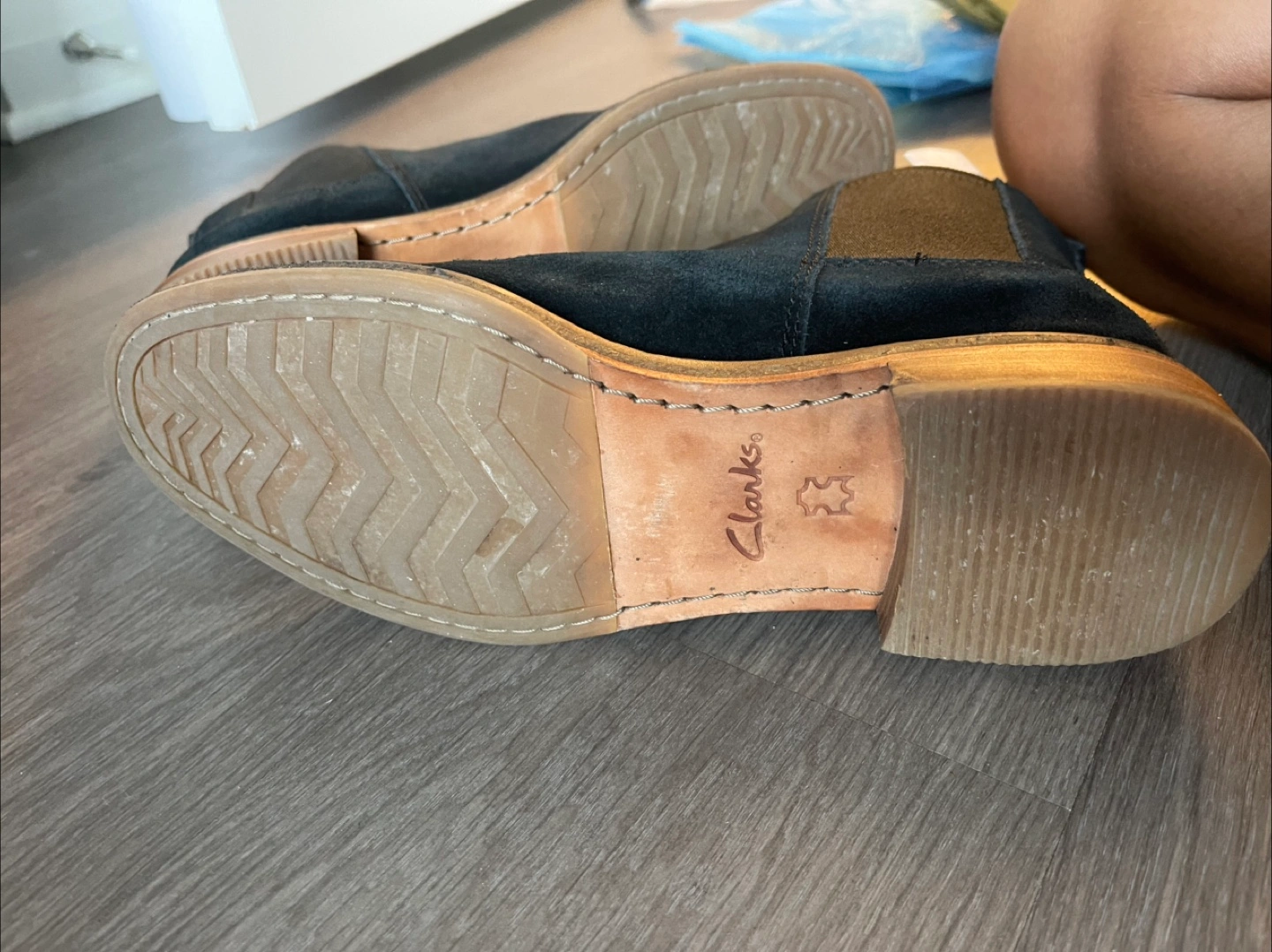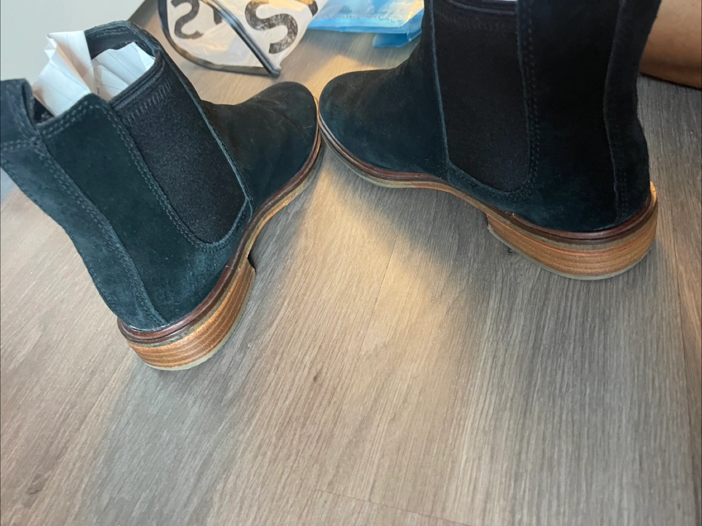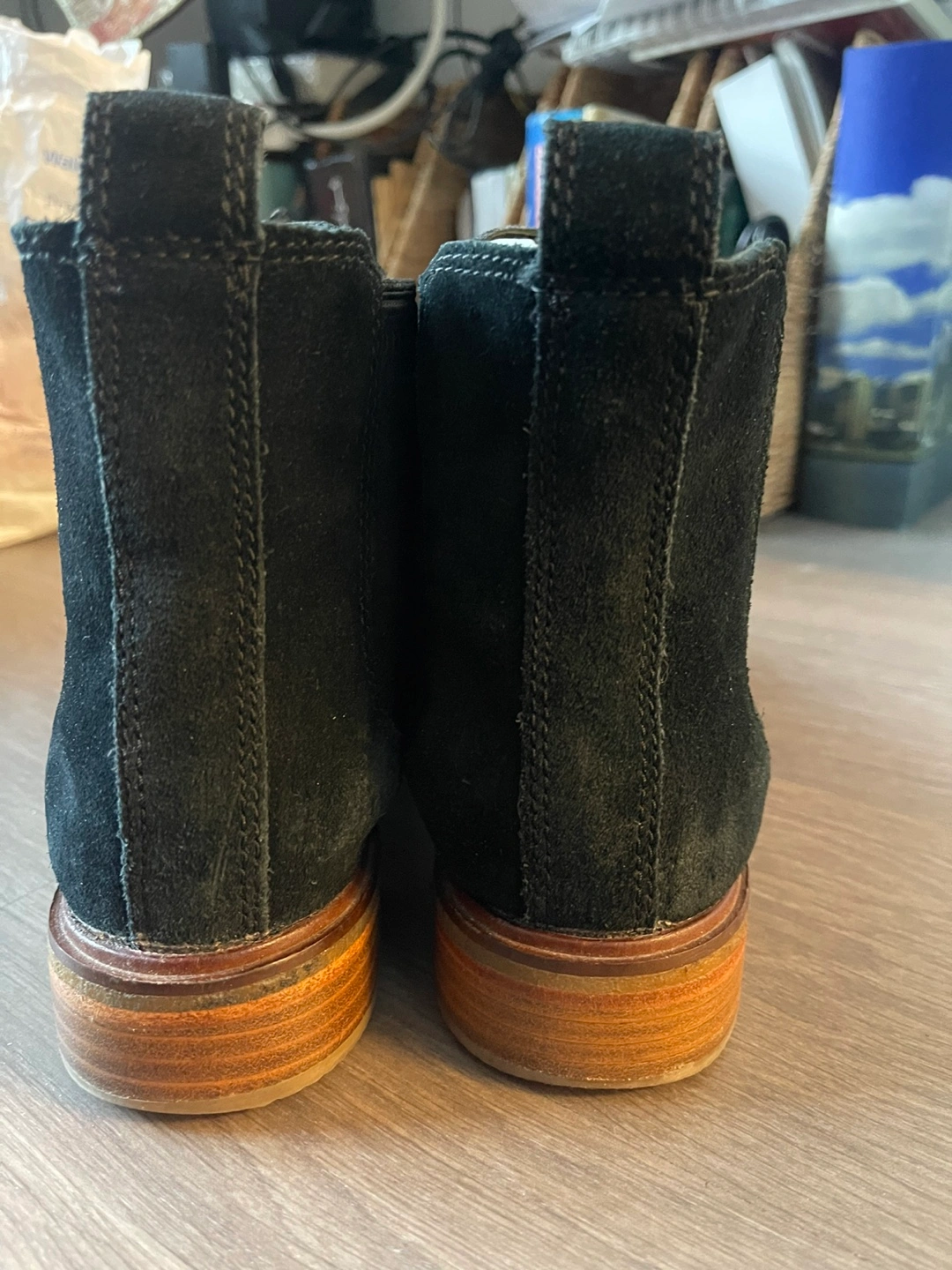 Selling a pair of Clarks Chelsea boots in black suede. They are in good condition and ready for a new home! These boots are super versatile and can be dressed up or down. They feature a classic Chelsea boot design with a comfortable fit.