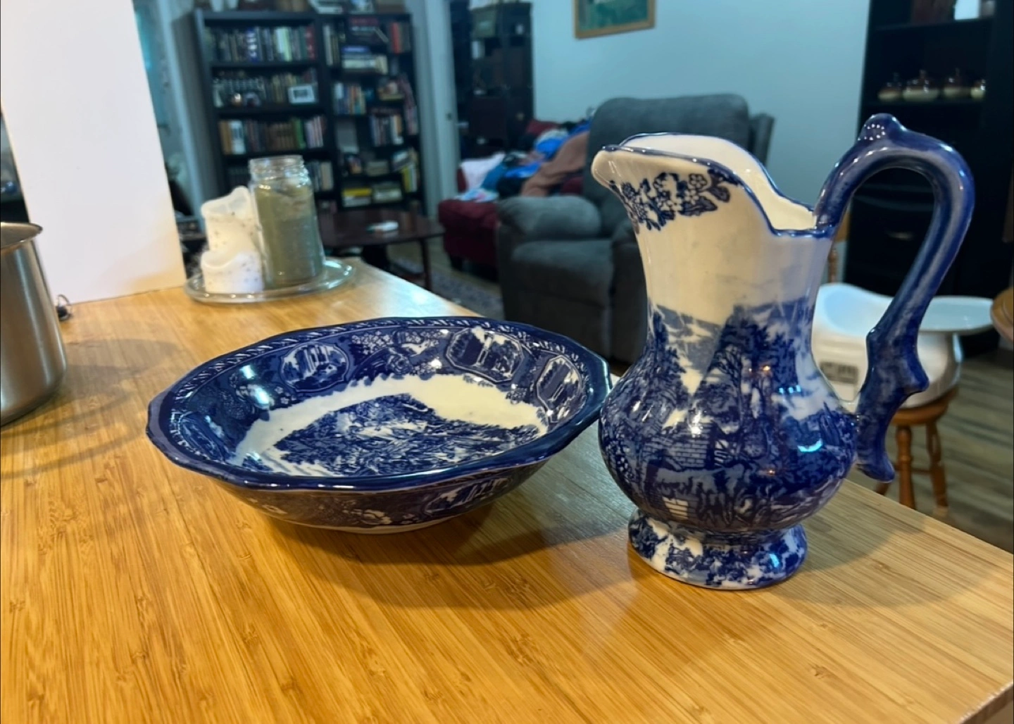 Selling a lovely vintage pitcher and bowl set! The set features a beautiful blue and white pattern. It would make a great addition to any collection or home decor