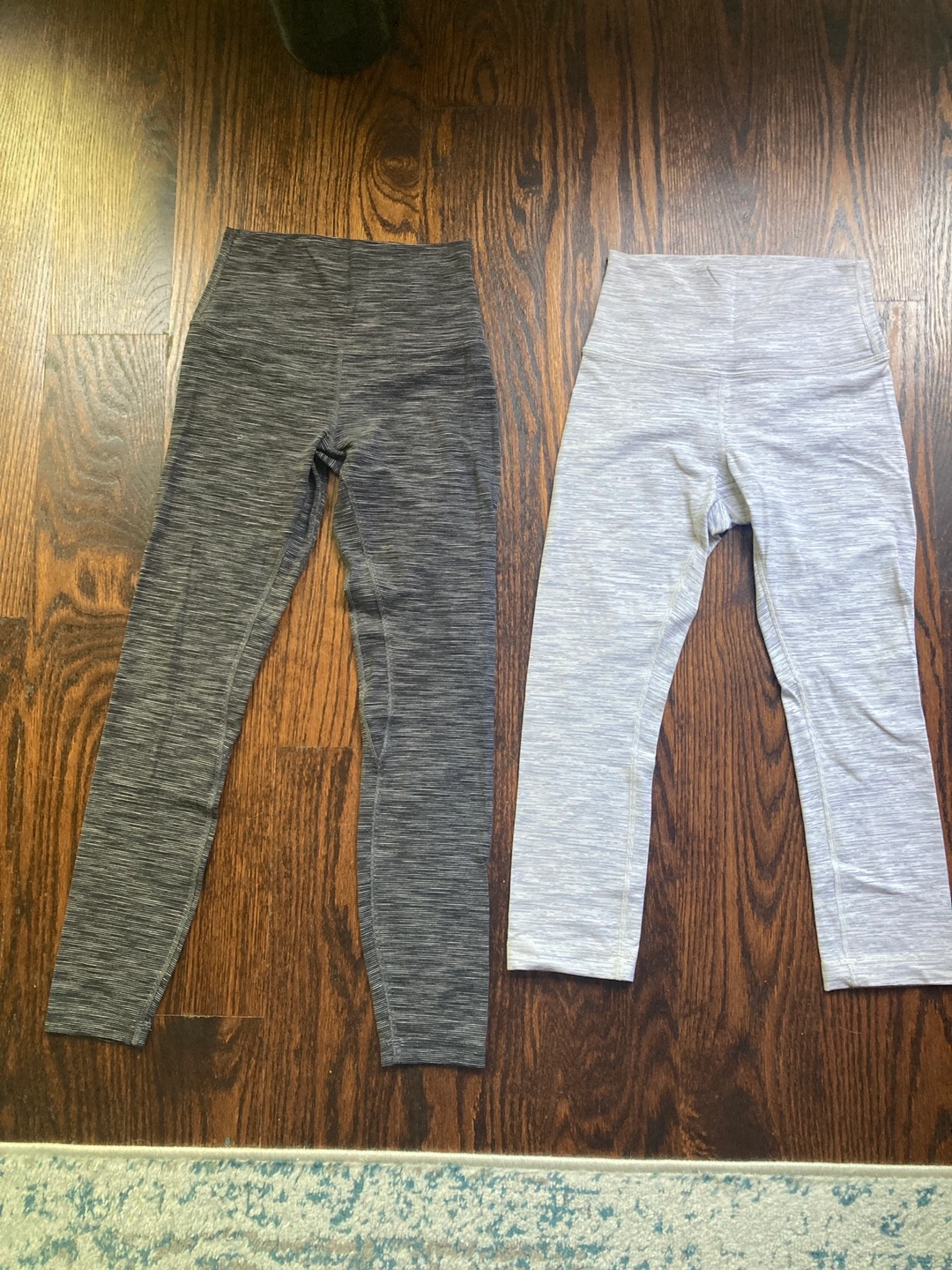 Price includes both pairs! One is dark grey and one is white. See photos for pattern details. Both are a size 4. No size tag on dark grey pair. White pair is cropped length. No pockets on either pair. No rips/pilling/stains. Price is firm. Cash only, please. Pickup is in midtown, in front of Lululemon at 2558 Yonge Street. A few lights north of Yonge & Eglinton.