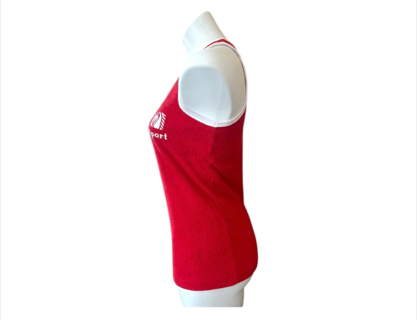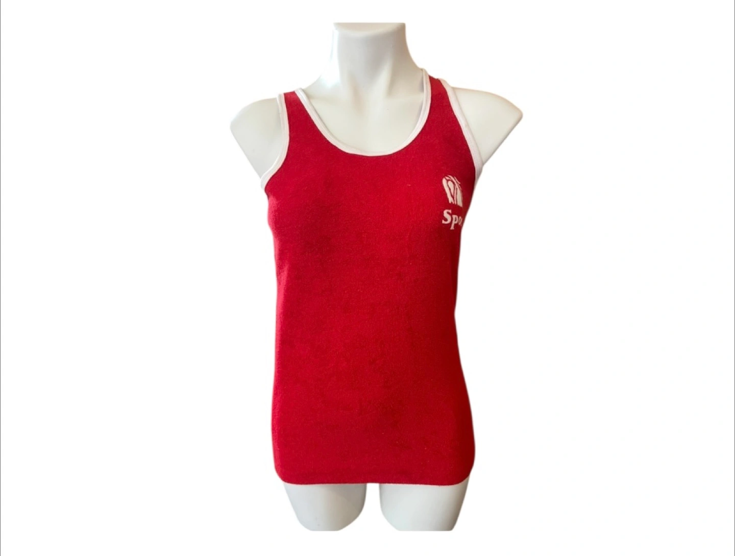 Vintage Authentic 80s Red Terrycloth Cotton Sleeveless Racerback Tank Top S/M 💎RARE Item Alert!💎 💎Certified authentic vintage item. Condition: 10/10. No Stains/Rips/Tears. Style Details: Material: Terrycloth. In the 80s, any sportswear was made out of original Terrycloth because the woven fabric could absorb large amounts of water. It is manufactured organically by weaving or knitting. This item is a high grade quality vintage item. .Scoop neckline .Racerback style / Sleeveless .Wide straps .Color: A bright rich red with white outlines in the collar/arm area .Horse image and ‘Sport’ logo on the left side of the chest area in white .Organic Cotton & Terrycloth material .Very soft and hypoallergenic Measurements (Inches): **Picture model is a size M **Clothing measured on flat surface - ONLY LEFT TO RIGHT - NOT ALL AROUND CIRCUMFERENCE Size: Can fit XS-Medium depending on your fit preference. Shoulder to shoulder: 10 Bust: 17 Waist: 16.5 Hips: 17 Arm width top to bottom: 10 Length from shoulder to bottom hem: 25.5