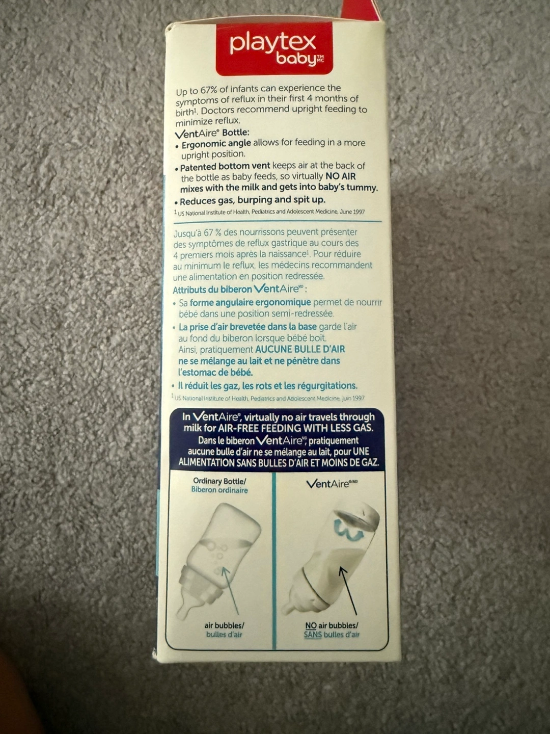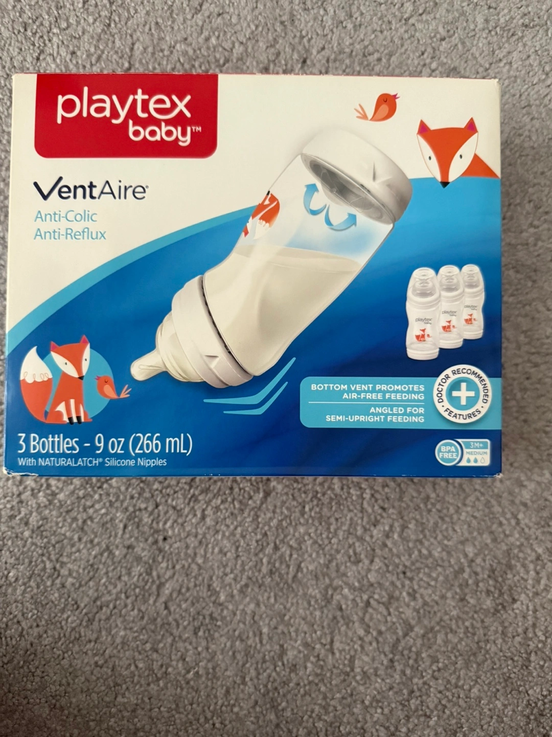Selling a a brand new never used box of Playtex Baby VentAire Anti-Colic bottles. - Includes 3 bottles, each 9 oz (266 mL) - Designed with NATURALATCH silicone nipples - VentAire bottles feature a bottom vent to promote air-free feeding, helping to reduce gas, burping, and spit-up - Angled design for semi-upright feeding Priority to quickest pick up in Innisfil (Belleaire shores subdivision) as item has been cross posted, TIA