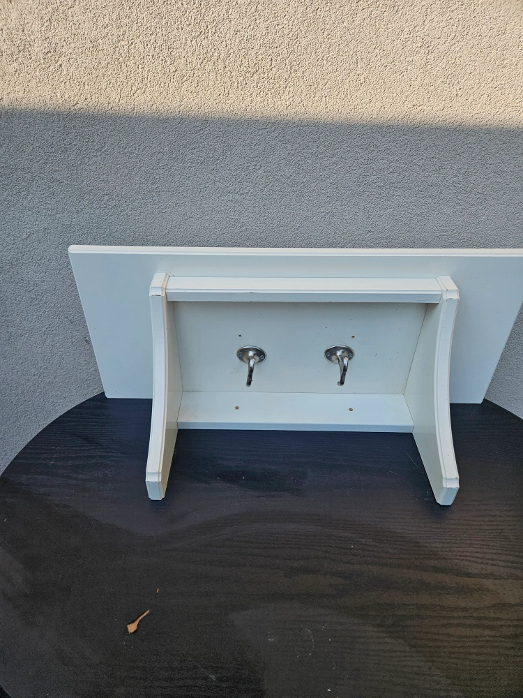 Here's a simple white wooden shelf, perfect for adding a bit of storage or display space! It measures approximately 24 inches in length and 11 inches in width. It's in good condition and ready for a new home