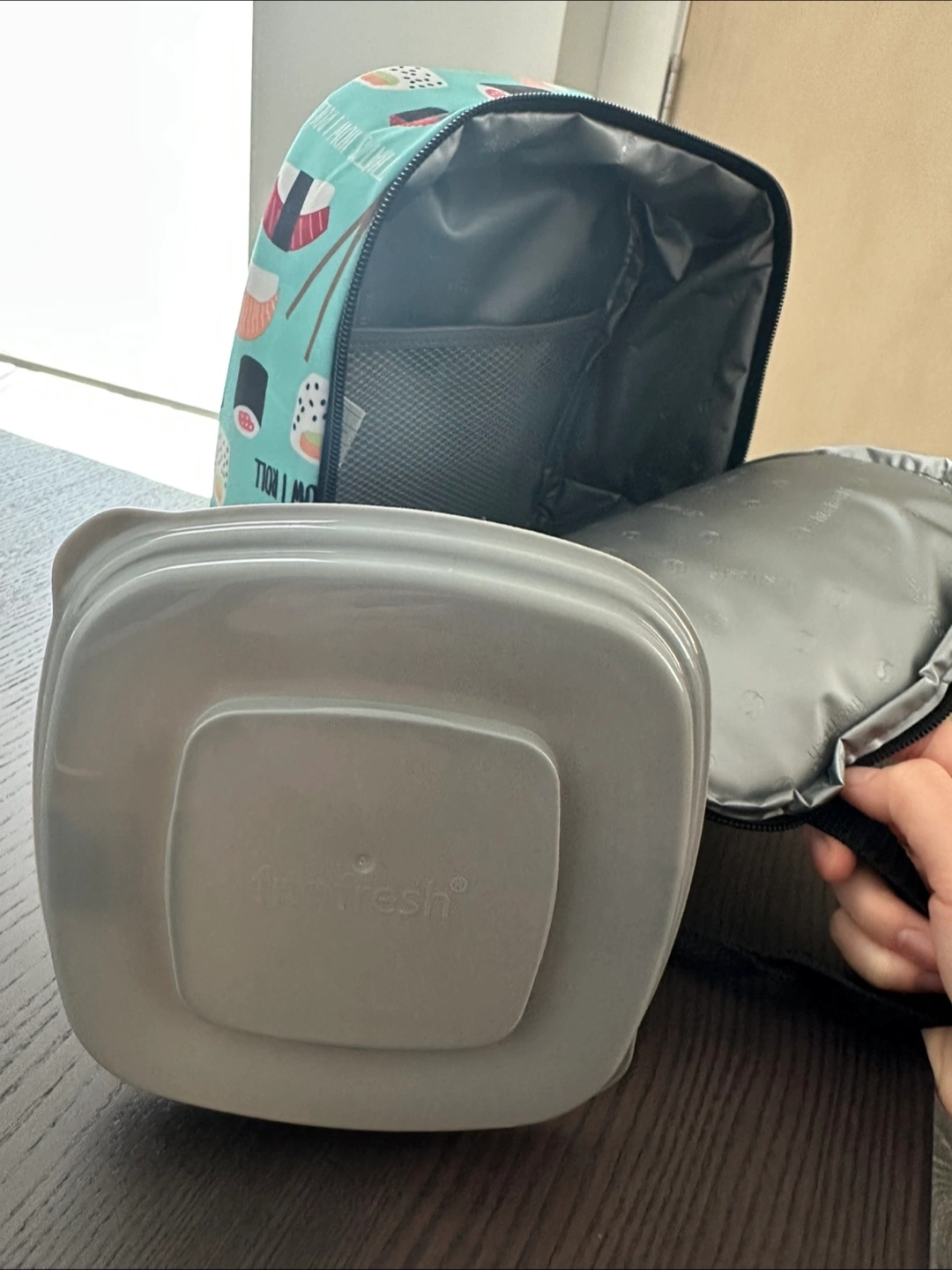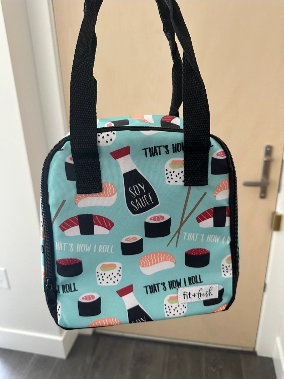 Keep your lunch fresh with this cute fit+fresh lunch bag! It features a fun sushi pattern and comes with a reusable container to keep your food organized. Perfect for school, work, or picnics!