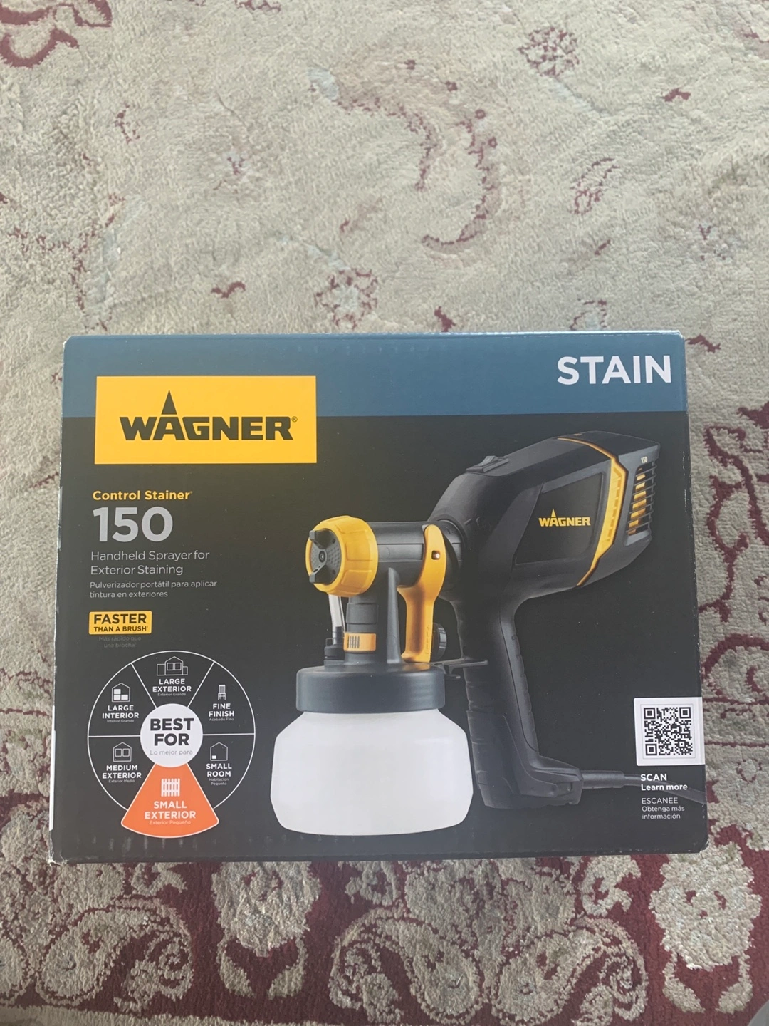 I'm selling a Wagner Control Stainer 150 handheld sprayer for exterior staining! It's designed for small exterior and interior projects, offering a fine finish. The sprayer has a 20 oz cup and is suitable for transparent and semi-transparent stains, sealers, and enamels. It can spray up to 4.1 fl oz/min using 120 volts, 60 Hz, and 2.5 amps