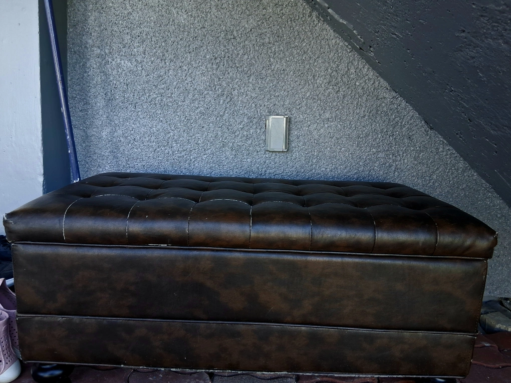 This is a lovely brown leather storage ottoman! It's in great shape and perfect for adding extra seating and storage to your living room or bedroom. The top lifts up to reveal a spacious interior, ideal for storing blankets, pillows, or other household items. It's a stylish and functional piece!