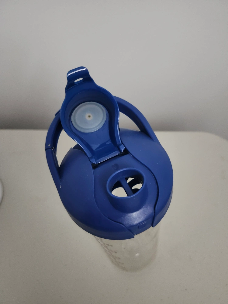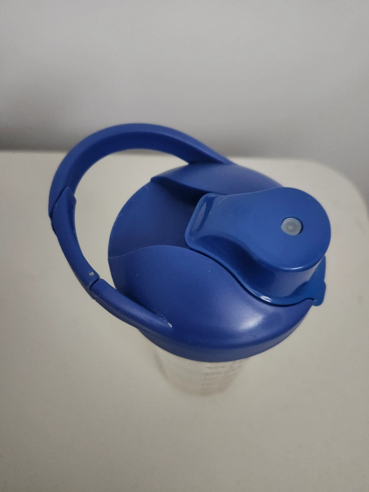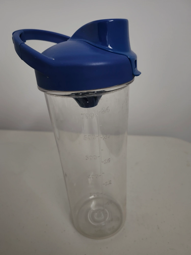Selling a clear water bottle with a blue lid. It measures up to 700ml/24oz. Perfect for the gym or everyday use!