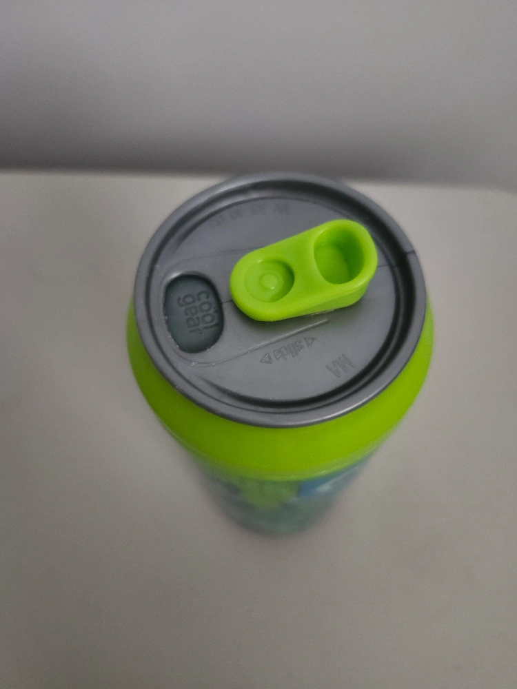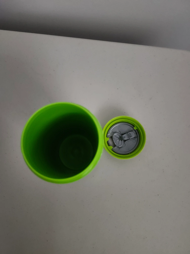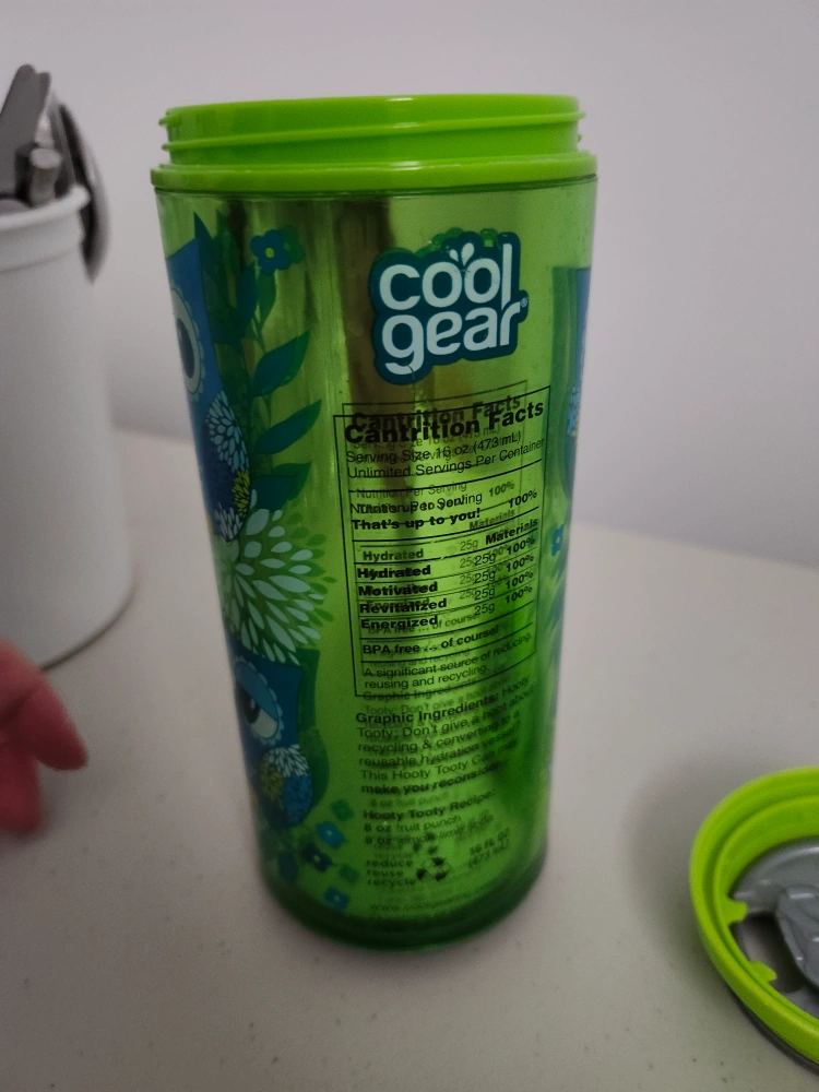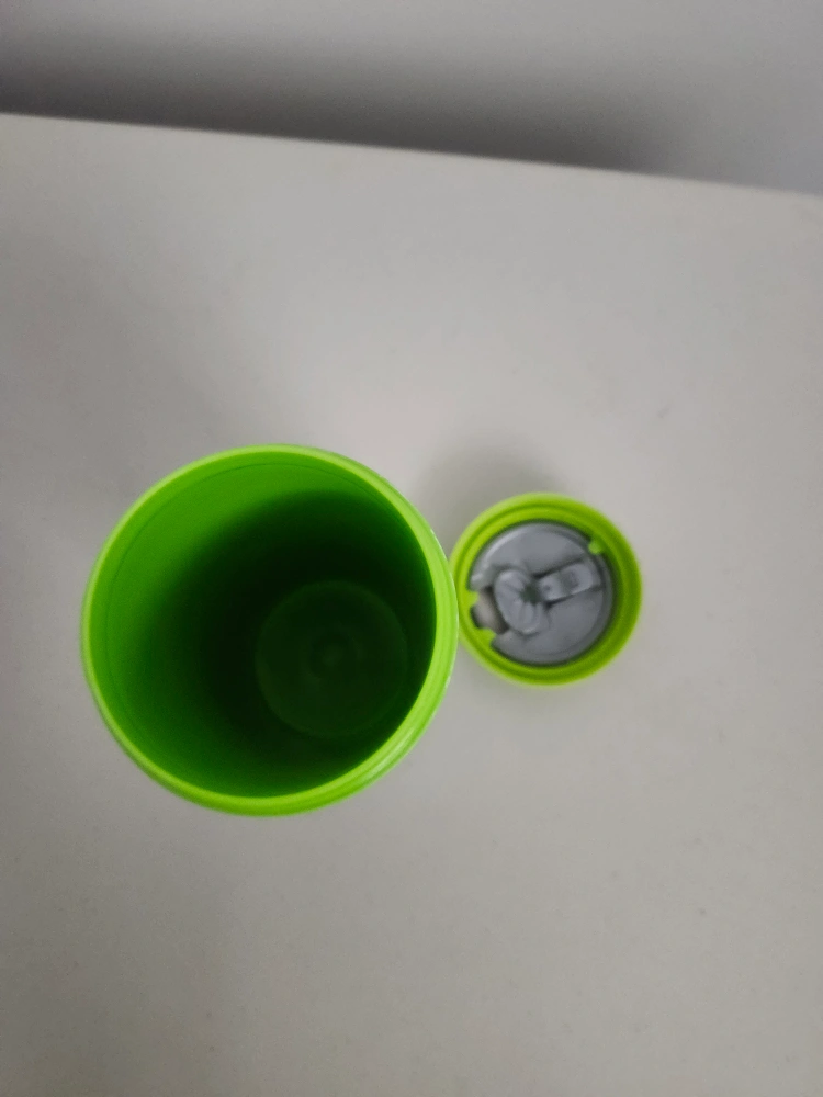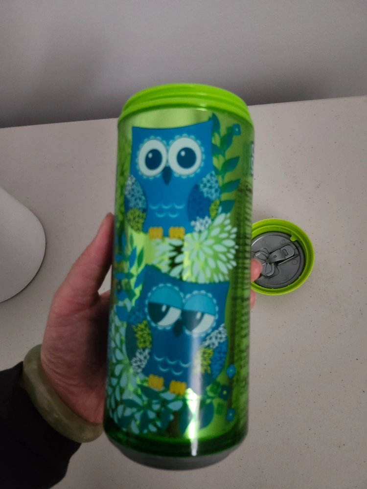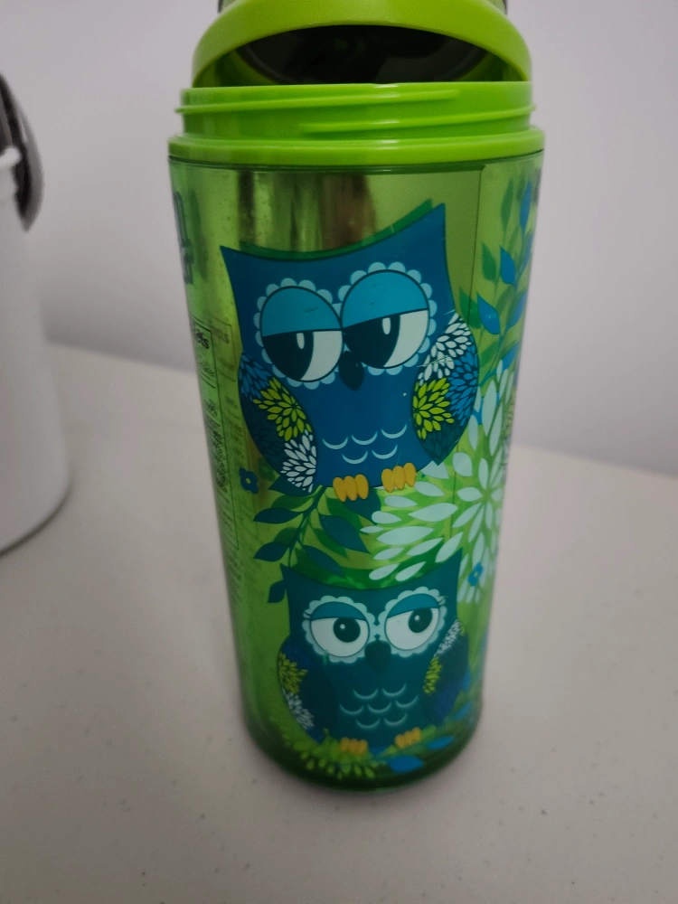 This travel mug features a cute owl design in shades of blue and green. It's perfect for keeping your drinks hot or cold on the go. The lid is a bright green colour. It's in great shape and ready for a new home!