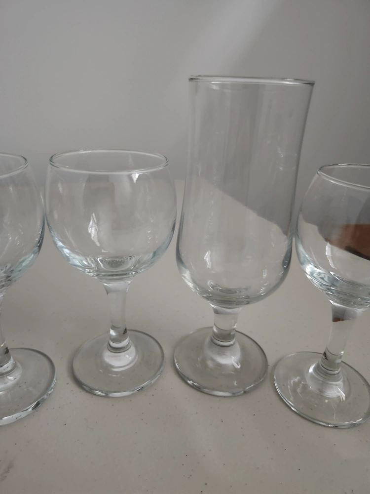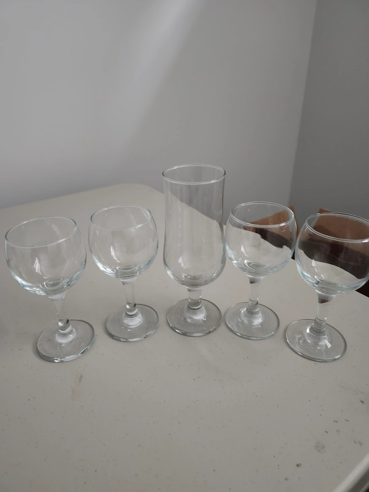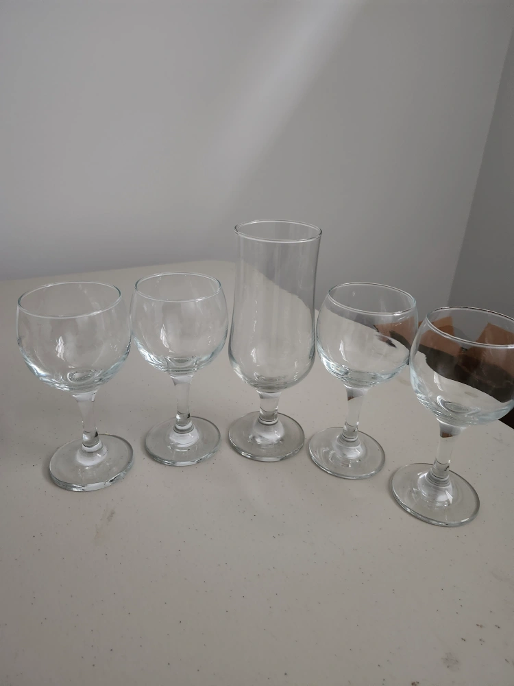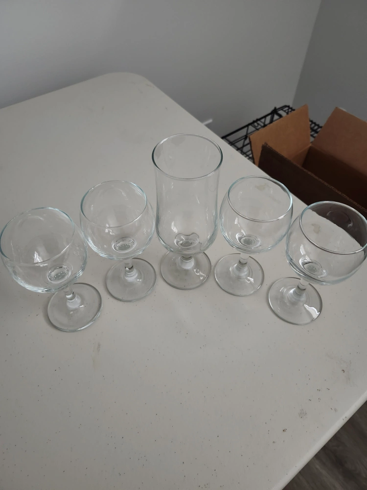 Selling a set of five assorted glass stemware. They're in great shape and ready for your next dinner party or special occasion! Perfect for wine, cocktails, or any beverage you fancy