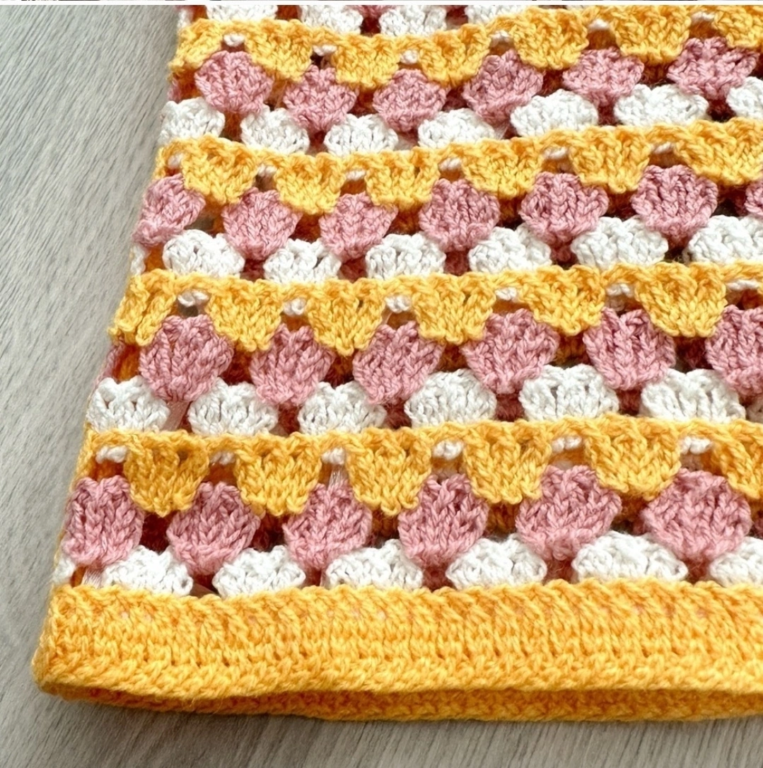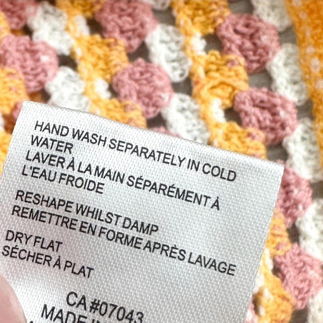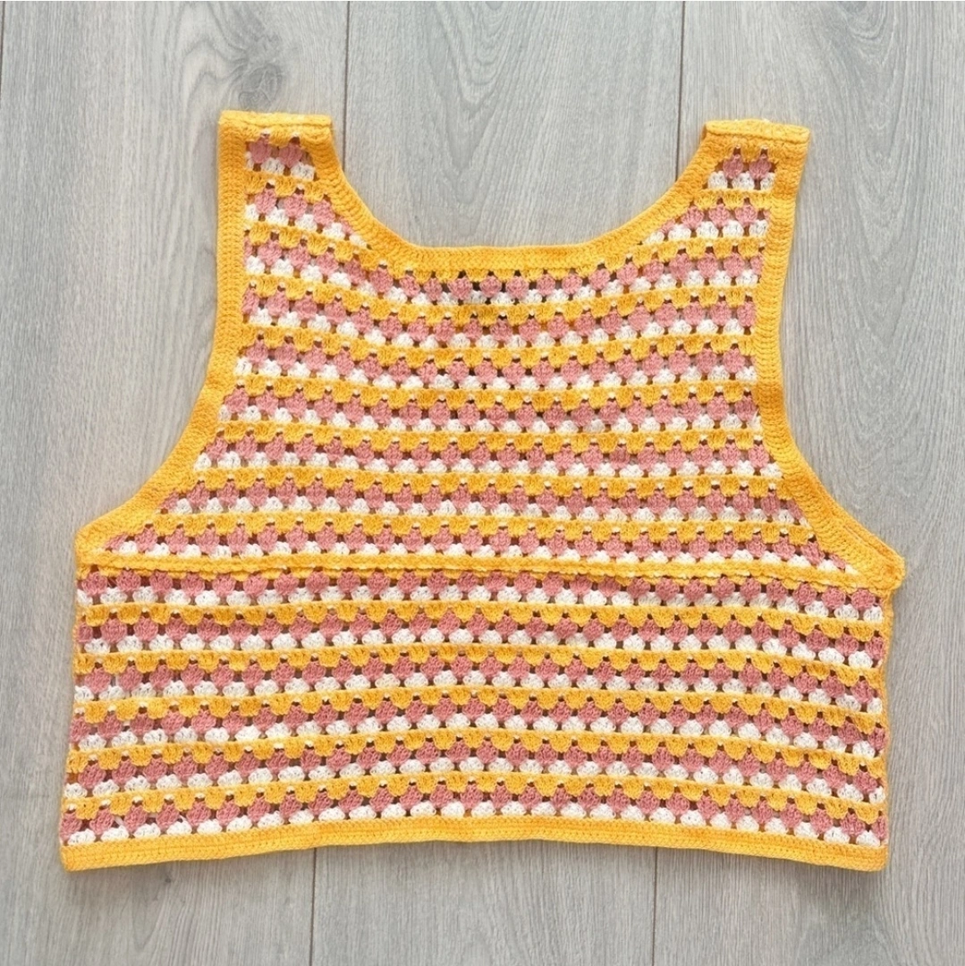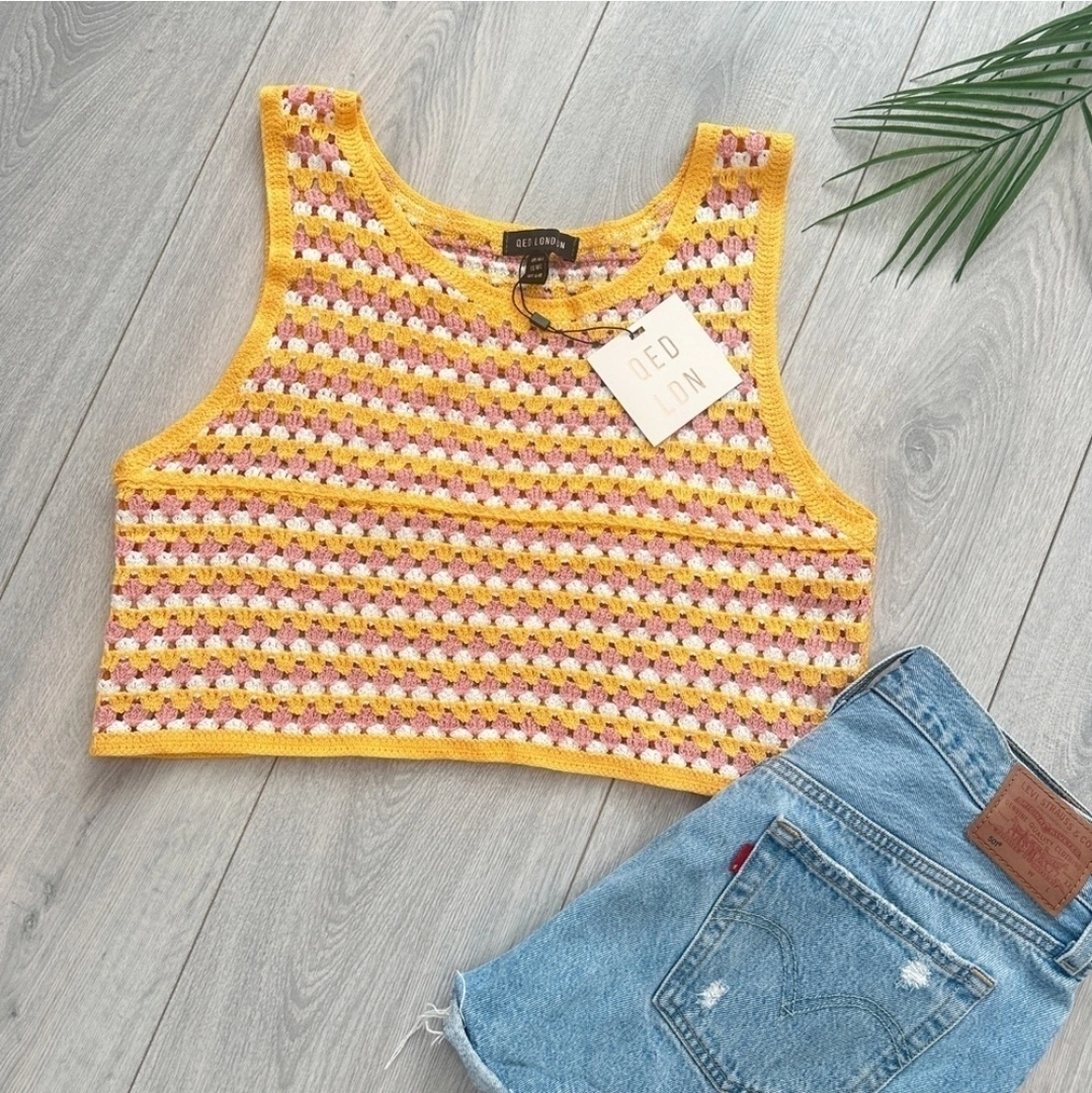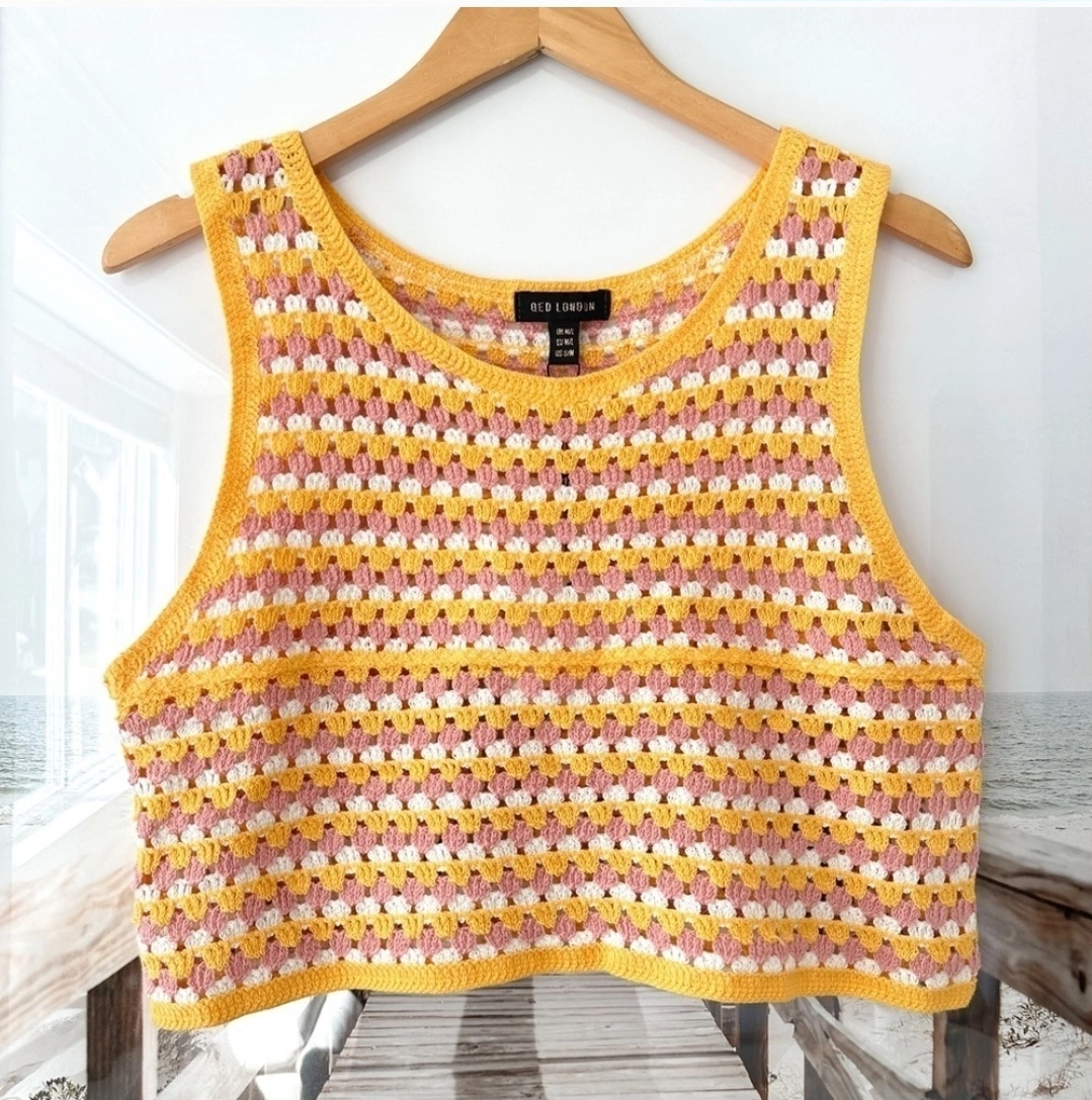 This Red London crochet tank top is super cute for summer! It features a colourful design with yellow, pink, and white. The size is UK 12, which is approximately a US 8. It's in great condition and ready for a new home
