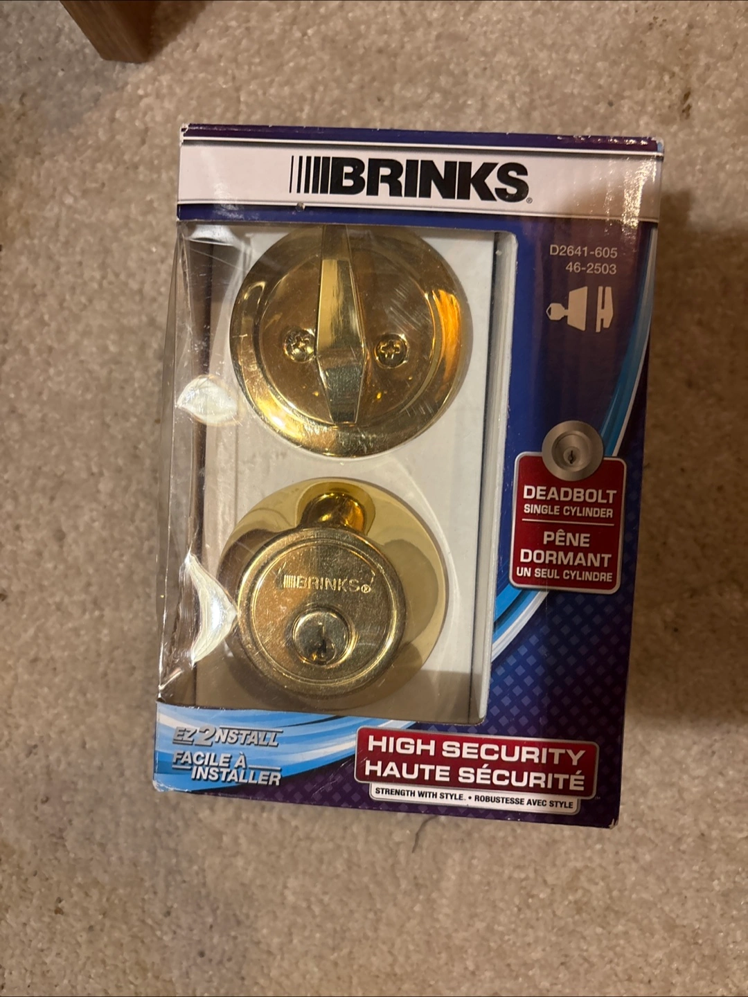 Never used! Selling a Brinks high security single cylinder deadbolt in polished brass. It features: - Meets ANSI Grade 2 standards - Anti-Pick Resistant Plus a Drill Resistant Pin - 2-way adjustable latch - Deadbolt with steel anti-saw pin - 4-way adjustable latch It's easy to install and offers strength with style
