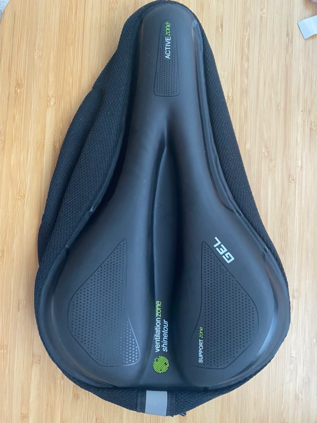 This is an Active Zone gel bike seat cover. It features a ventilation zone and support zone for extra comfort. I can meet at Adelaide east & sherbourne or king station most of the days!