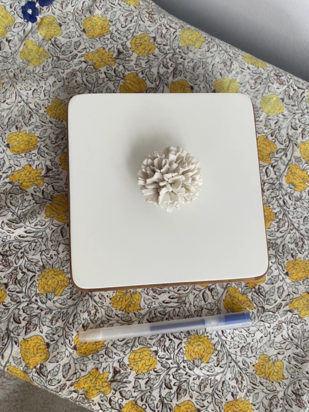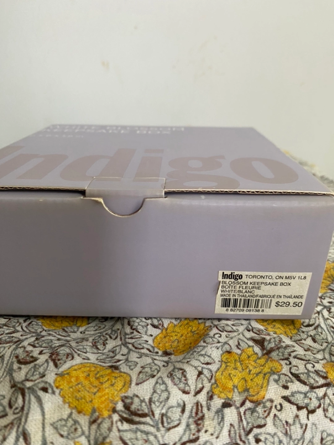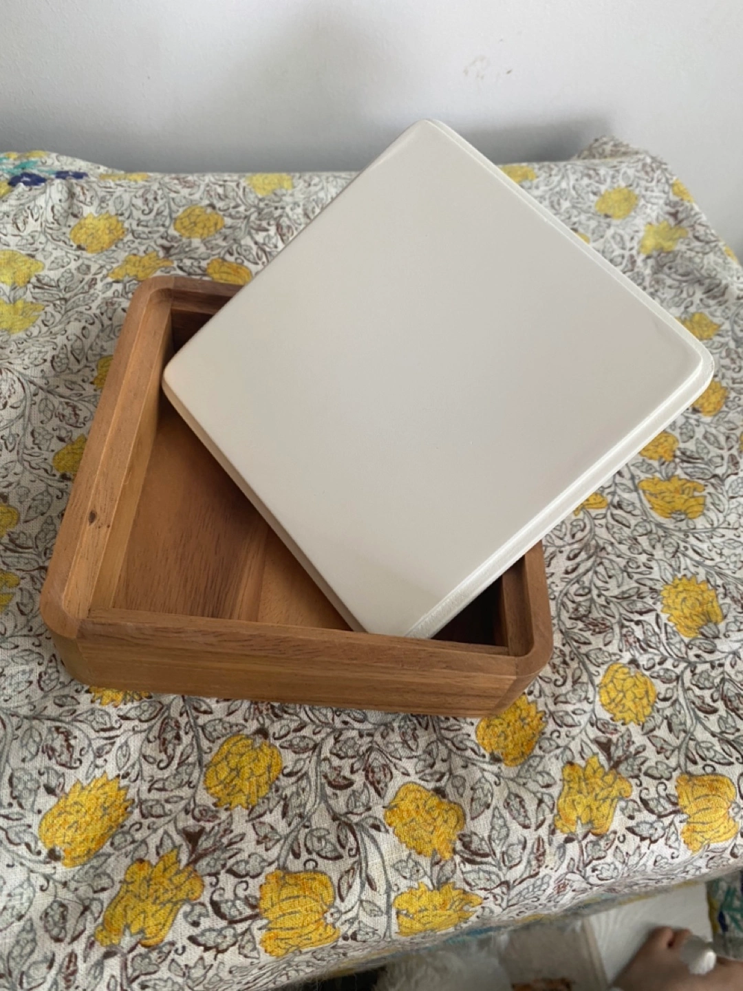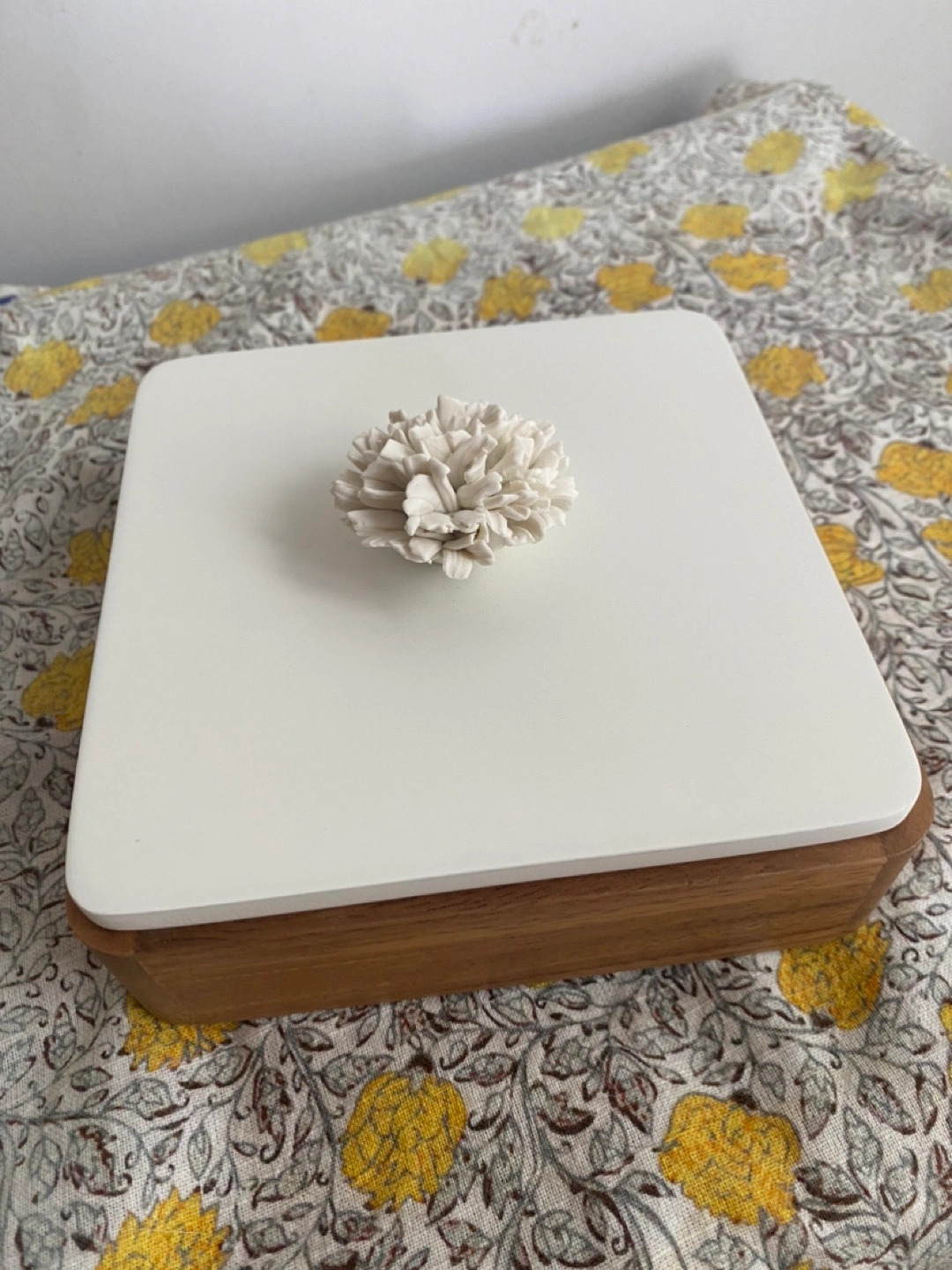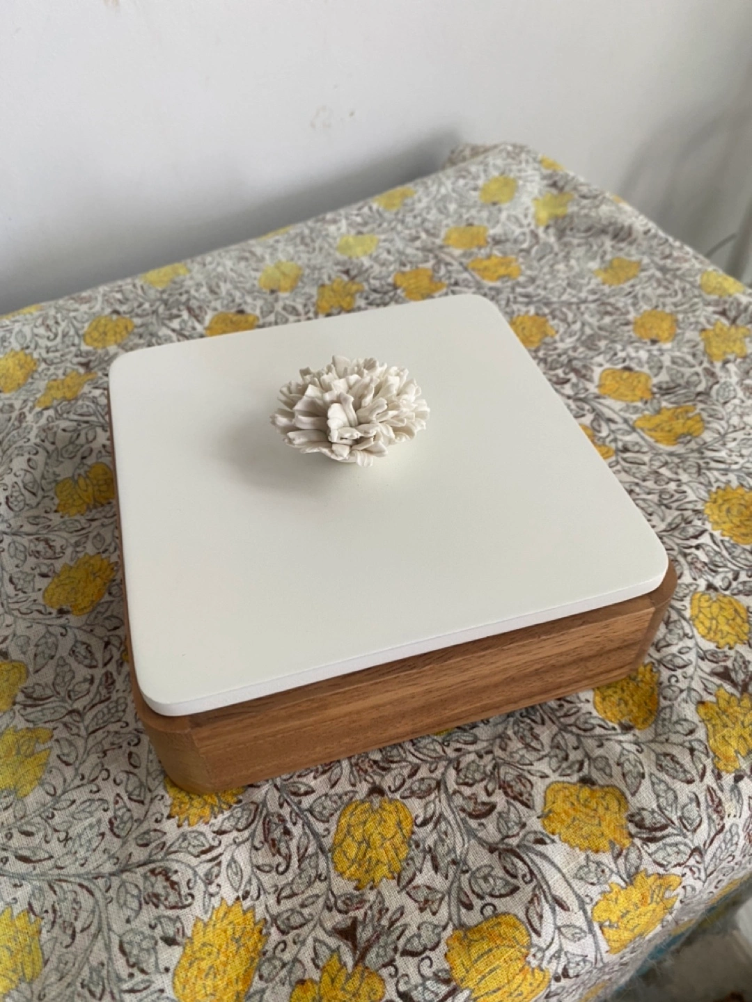 Here's a cute decorative box with a white lid and wooden base! The top has a unique floral design element I can meet at Adelaide east & sherbourne or king station most of the days!