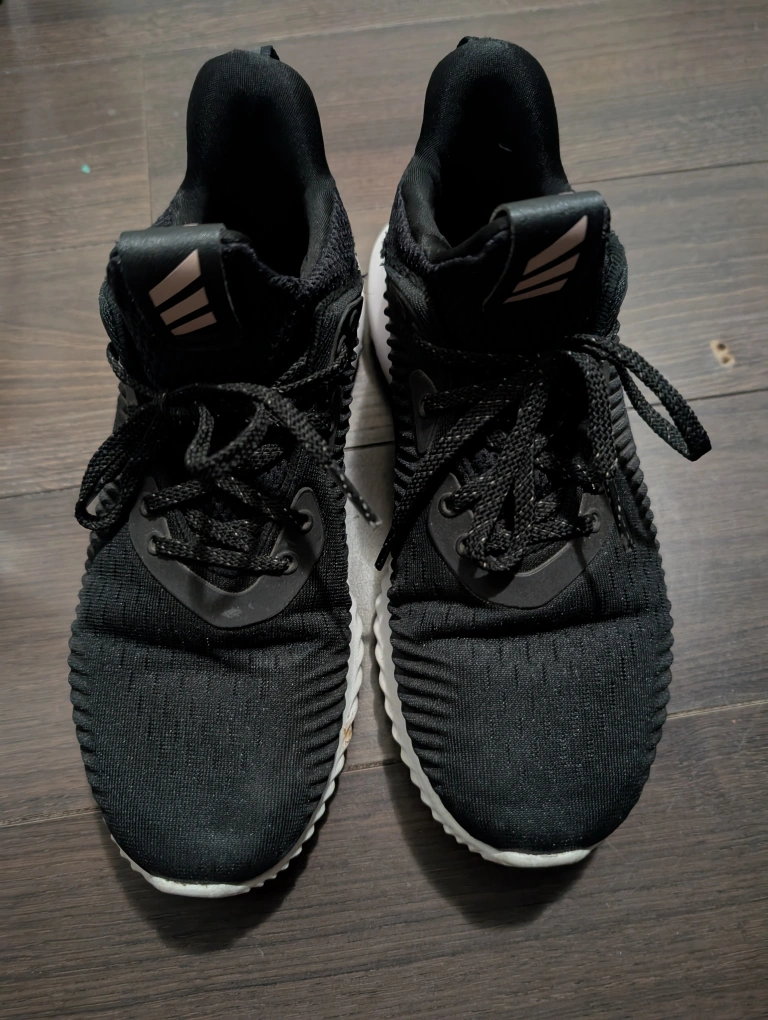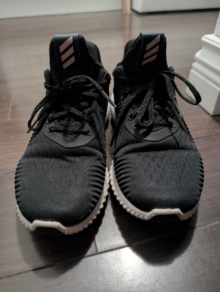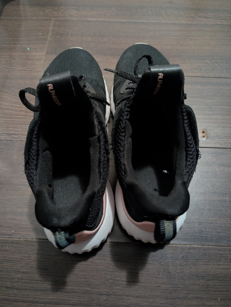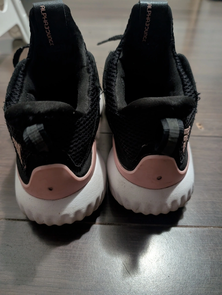 Selling a pair of Adidas Alphabounce shoes. They are black with a white sole and pink accent. They are in used condition, but still have lots of life left!