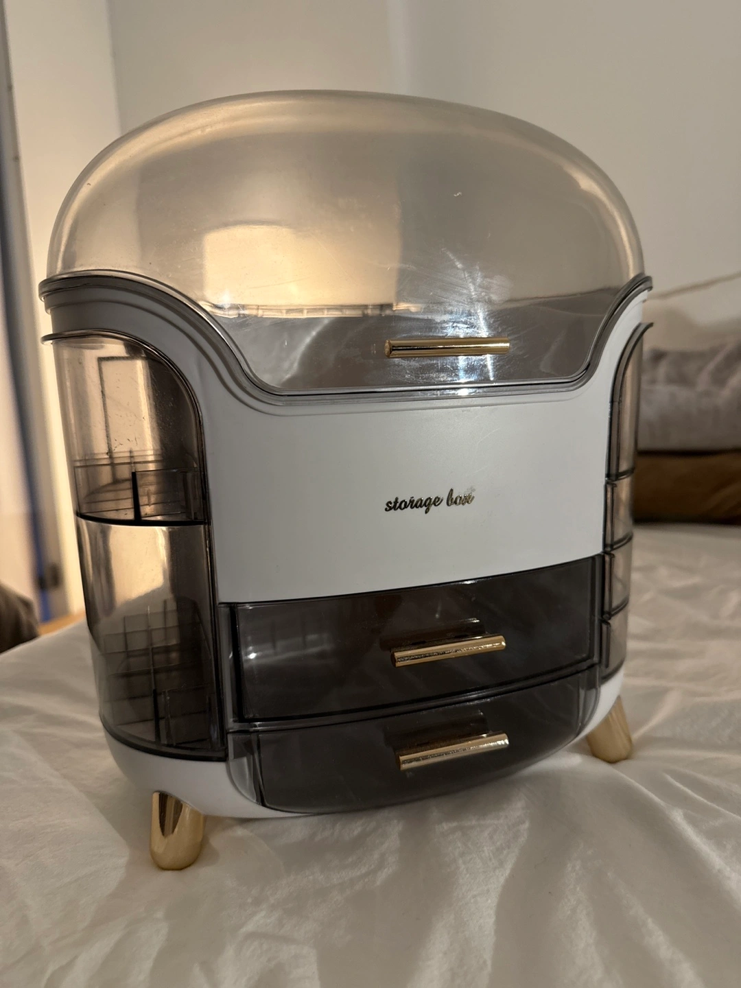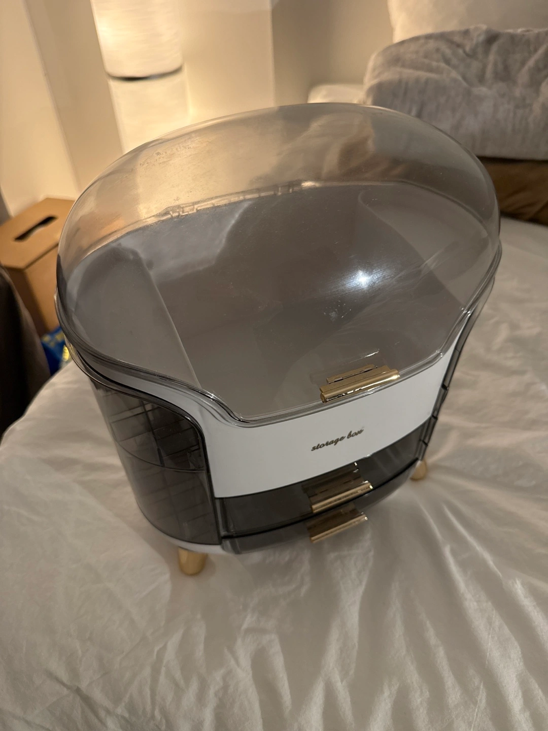 Selling a cute acrylic storage box! It features a clear dome lid and two drawers, perfect for organizing your makeup or small accessories. It's in great shape and ready for a new home