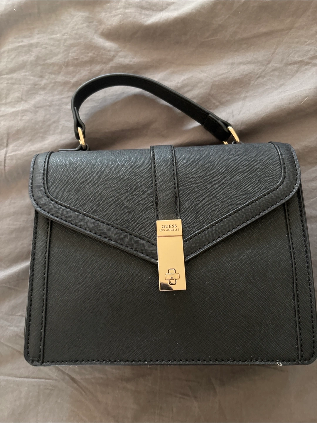 This is a cute Guess Los Angeles satchel handbag in black. It's a stylish and practical accessory to complete your outfit. The interior has a logo pattern.