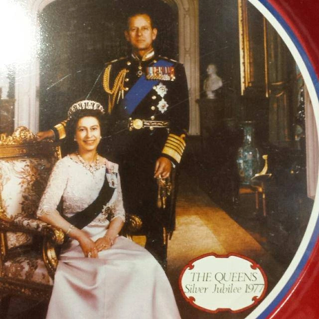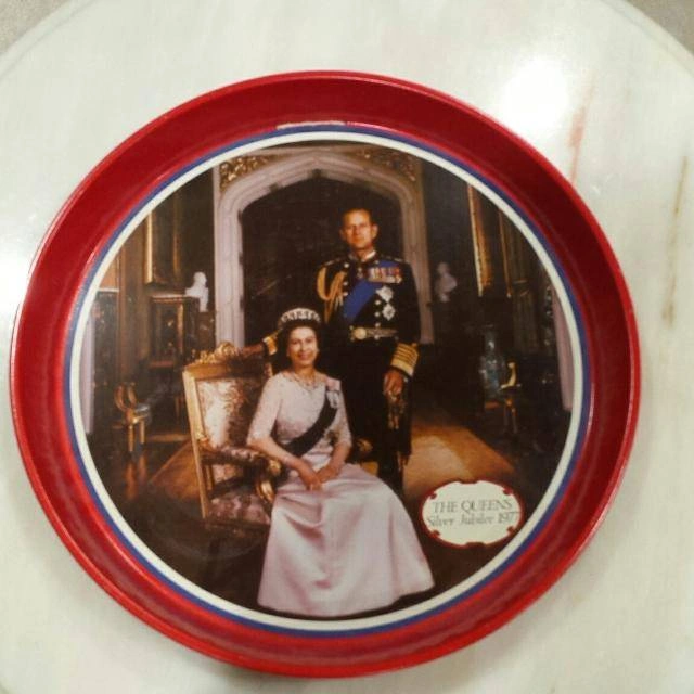 Celebrate a royal milestone with this vibrant metal beer tray featuring Queen Elizabeth II and Prince Philip in an official portrait from the 1977 Silver Jubilee. The tray has a 1" lip and the original Giftcharm “Made in England” label on the back. Shows some surface scratches consistent with age (see photos), but the image still displays beautifully. Comes with a string attached for easy wall hanging.