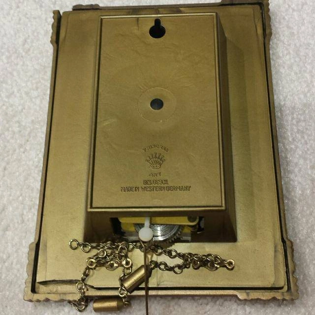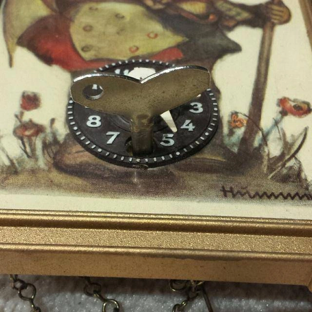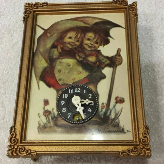 Charming vintage Hummel wall clock from the 1950s, made in West Germany. Features a delightful illustration of two children under an umbrella, signed “Hummel ’36,” with ornate gold-toned frame details. This mechanical clock comes with its original key and still retains the “Made in Western Germany” mark, making it a wonderful collectible for Hummel and vintage clock enthusiasts. Includes original key. Small piece missing from the top right corner of the frame (see photos), light wear consistent with age. Perfect for collectors, vintage home décor, or as a unique gift.
