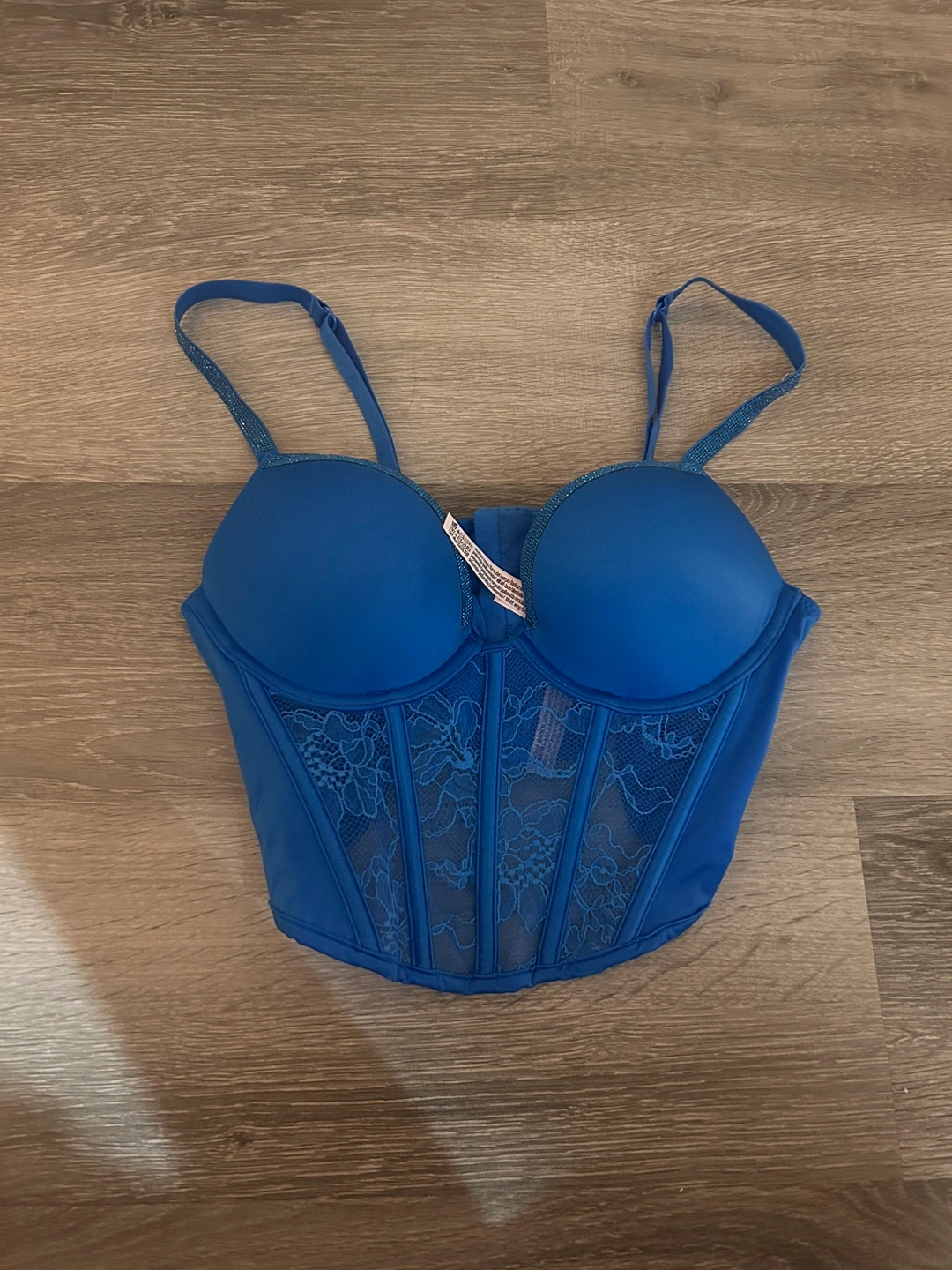 Selling a Victoria's Secret bustier in a vibrant blue color. It features a beautiful lace design on the front. Perfect for adding a touch of elegance to your wardrobe!