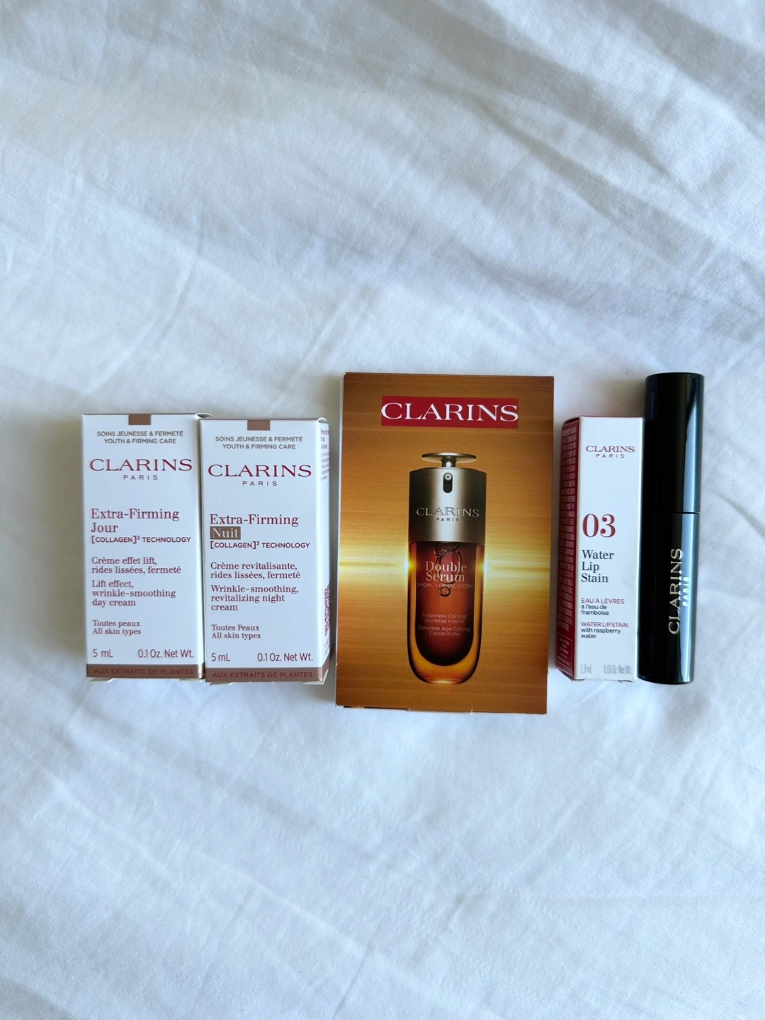 Brand new, unused Clarins beauty products. Included: - Extra Firming day cream, 5 ml - Extra Firming night cream, 5 ml - Double Serum [HYDRIC + LIPIDIC SYSTEM] 3 x 0.9 ml - Water Lip Stain in 03 Red Water, 2.8 ml - Wonder Volume Mascara XXL in 01 extreme black, 3 ml Pickup in Richmond Centre or Lansdowne. Cash only.