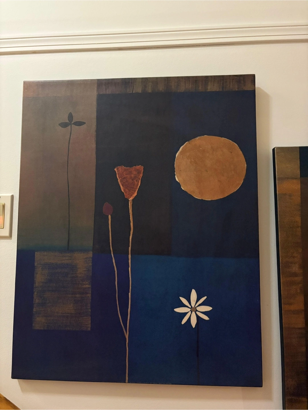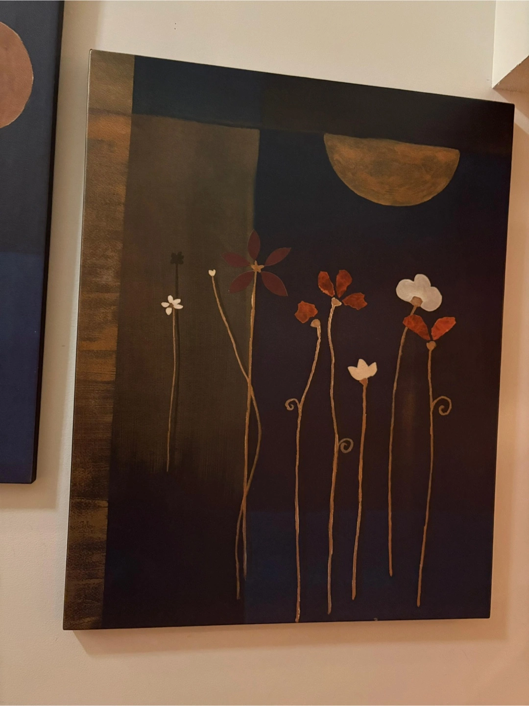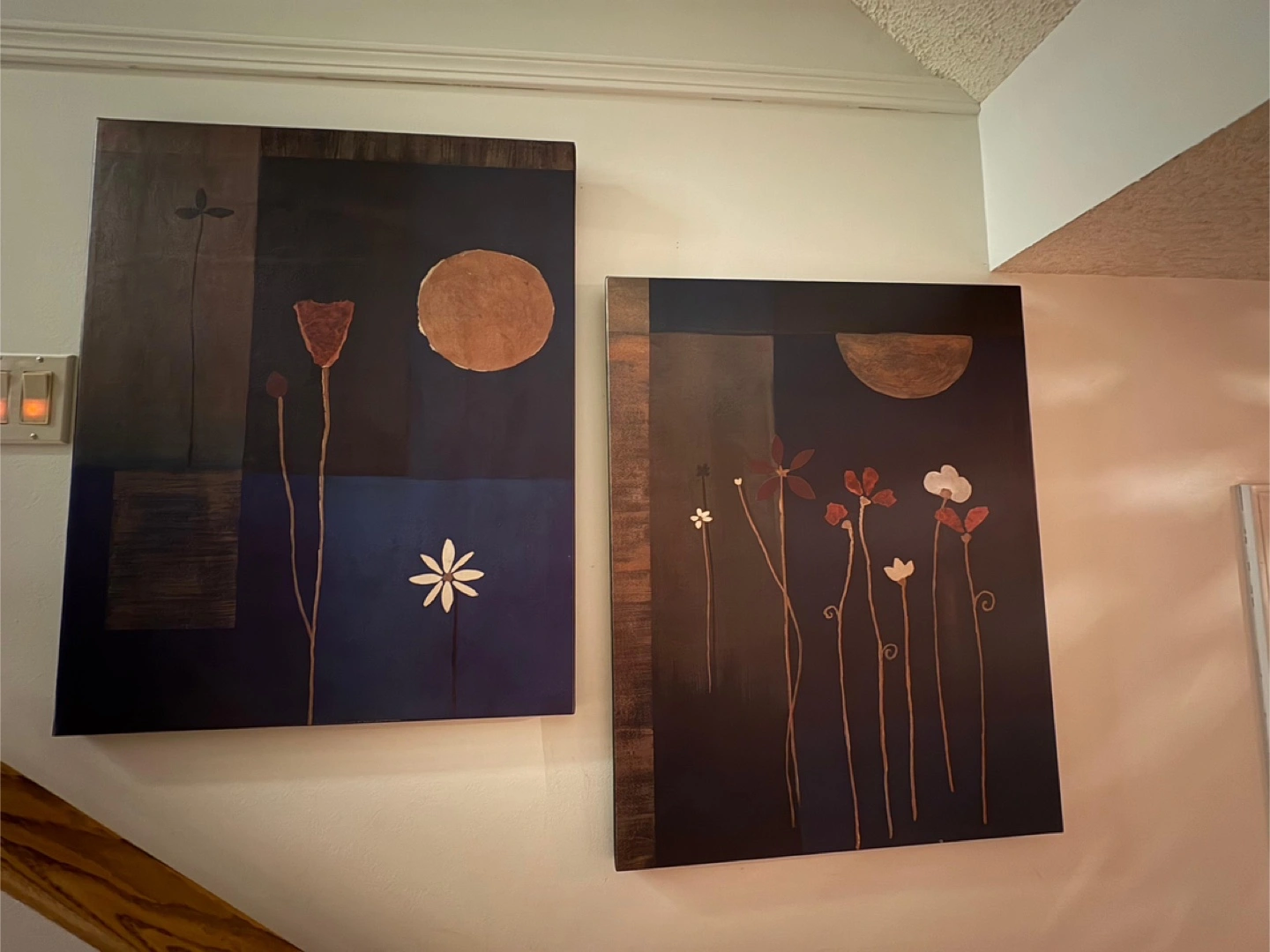 Two beautiful floral canvas paintings. Dimensions- 29*24 inches. These pieces feature a modern design with stylized flowers and a rich, dark colour palette. Perfect for adding a touch of elegance to any room in your home