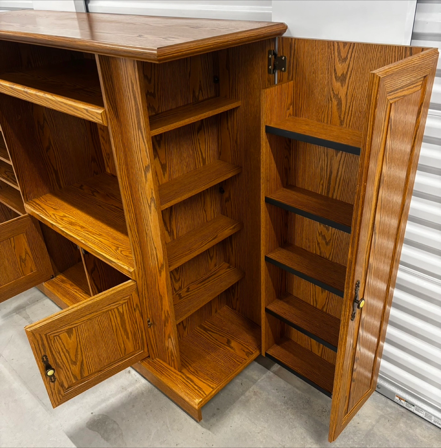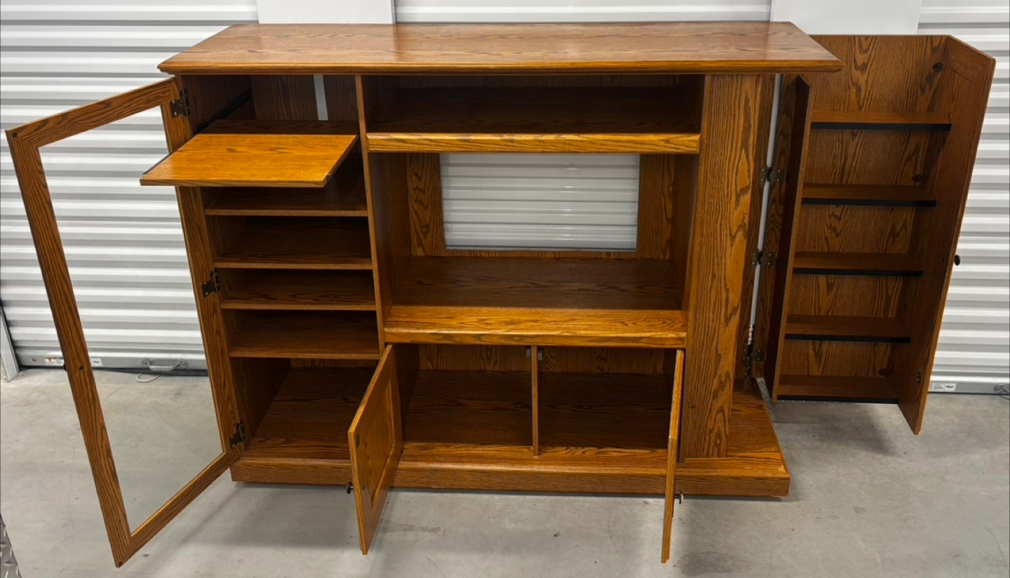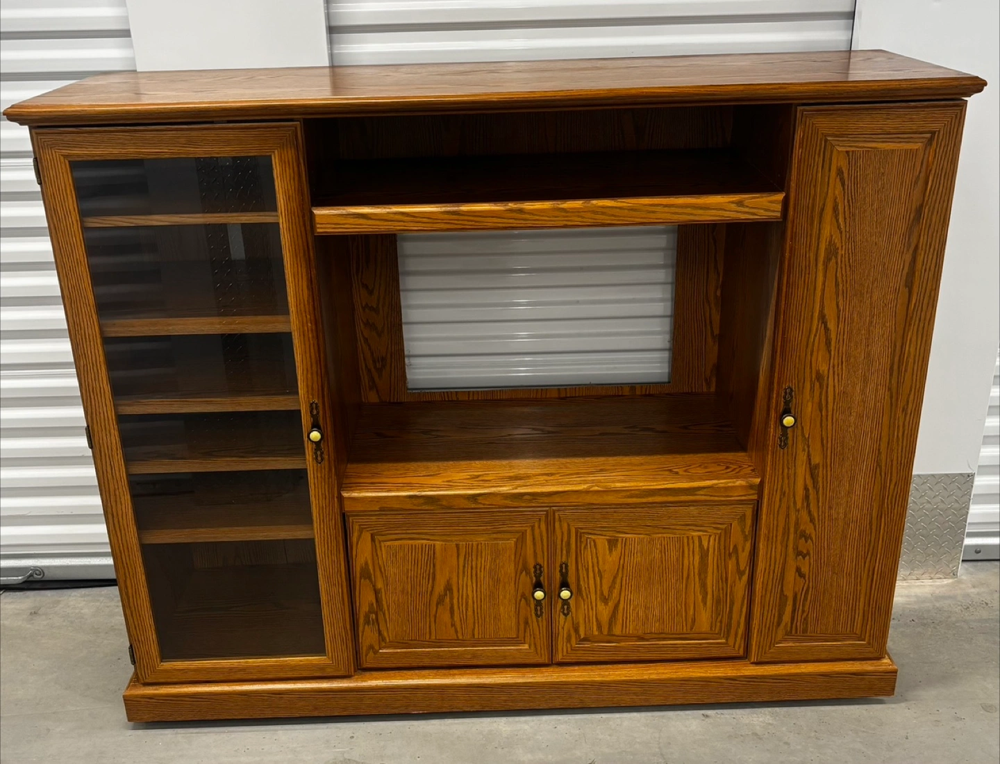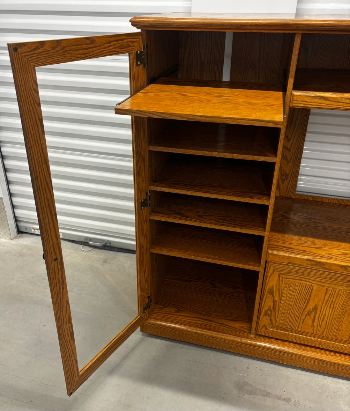 Solid oak entertainment center in excellent condition – built to last! ✅ Glass door with adjustable shelves for media or collectibles ✅ Pull-out shelf perfect for electronics or gaming consoles ✅ Hidden side storage with adjustable racks ✅ Bottom cabinets for extra storage Perfect for TV, stereo, books, décor, or as a statement storage piece in your living room. 📏Dimensions: 52” height 19 ½” wide 65 ½” length PICK UP ONLY in Oshawa – easy to move, rolls on built-in wheels. 💬 Message today to arrange pickup – first come, first served!