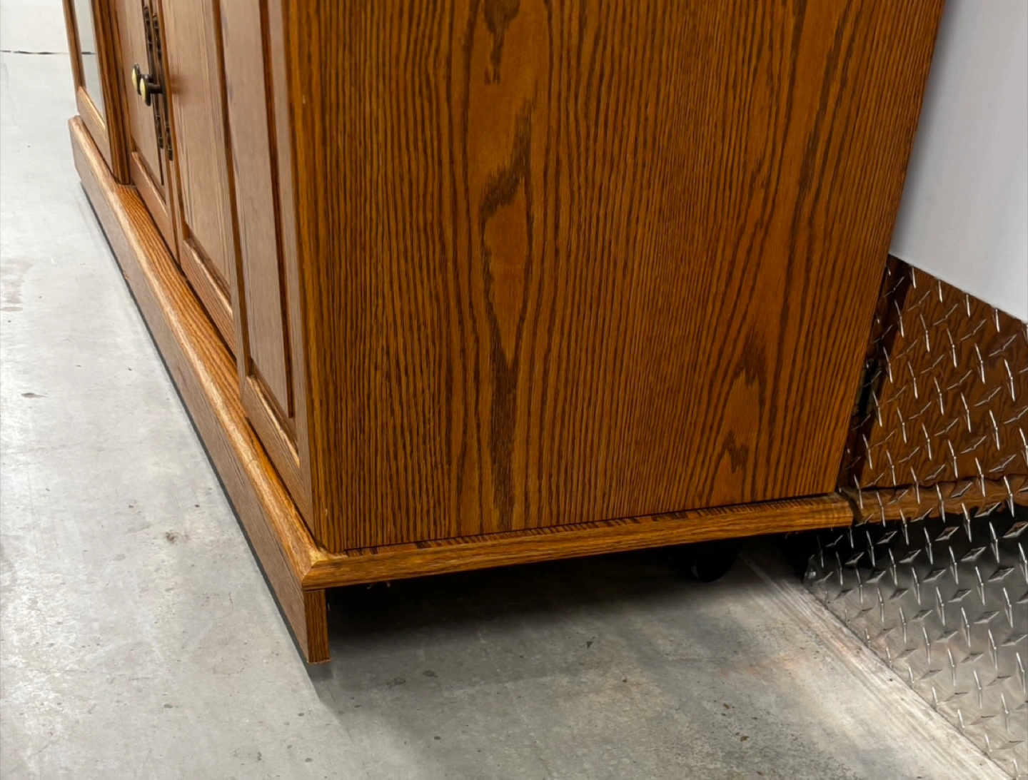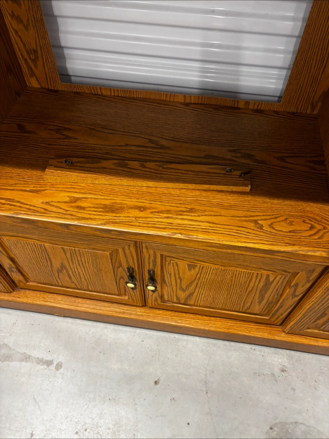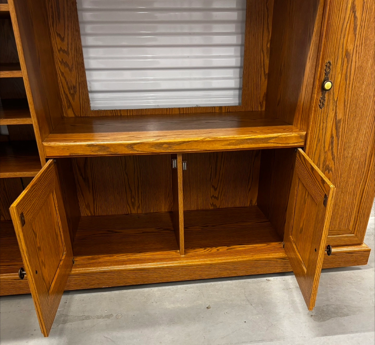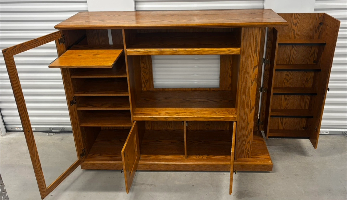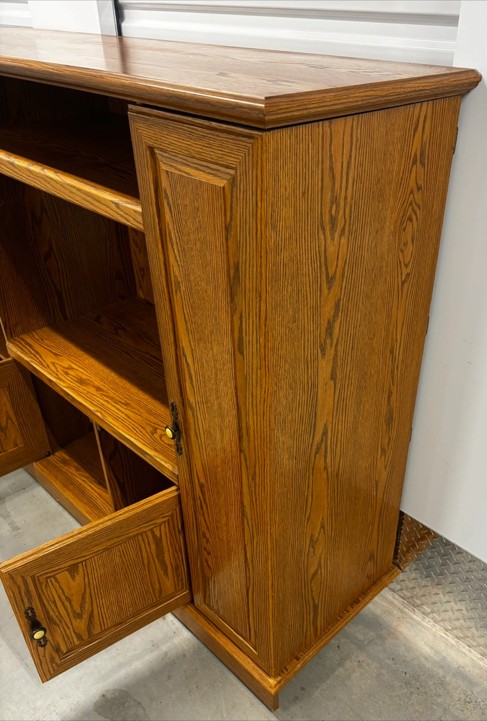 Solid oak entertainment center in excellent condition – built to last! ✅ Glass door with adjustable shelves for media or collectibles ✅ Pull-out shelf perfect for electronics or gaming consoles ✅ Hidden side storage with adjustable racks ✅ Bottom cabinets for extra storage Perfect for TV, stereo, books, décor, or as a statement storage piece in your living room. 📏Dimensions: 52” height 19 ½” wide 65 ½” length PICK UP ONLY in Oshawa – easy to move, rolls on built-in wheels. 💬 Message today to arrange pickup – first come, first served!