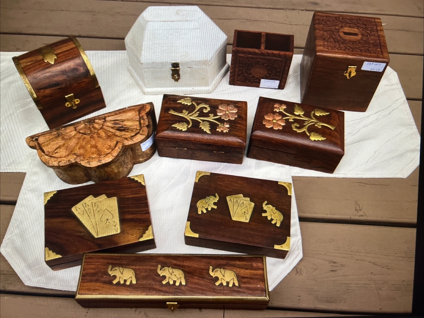 Brand new lovely hand-carved wooden boxes. They come in various shapes and sizes. perfect for holding pens, pencils, or other small items. Some features unique designs like playing cards and elephants, while others have beautiful floral design and a rich, warm colour. It would look great on a desk or shelf! That are great for storing small items or simply as decorative pieces.
