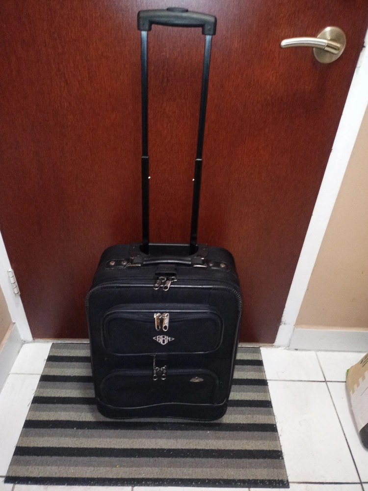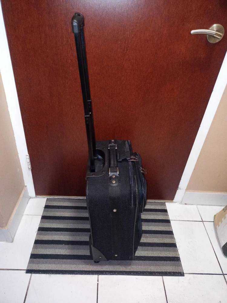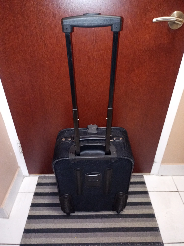 In good condition. Clean. All zippers, straps, wheels, and extendable handle work. See all pictures provided. Overall Measurements are: 15" inches in Width 22" inches in Height 8" inches in Depth. It weighs 9lbs. Check out my other listings.