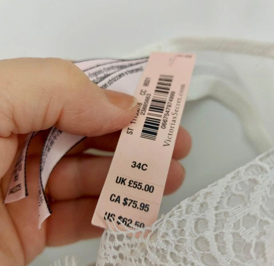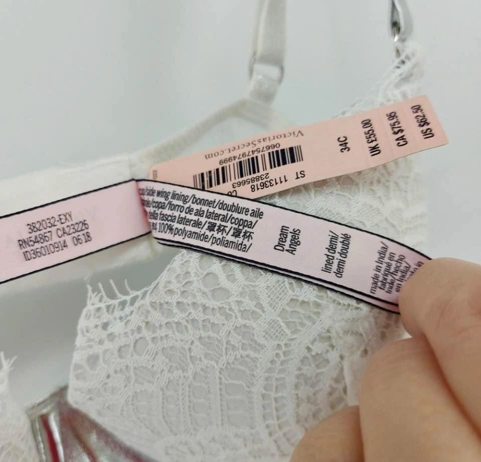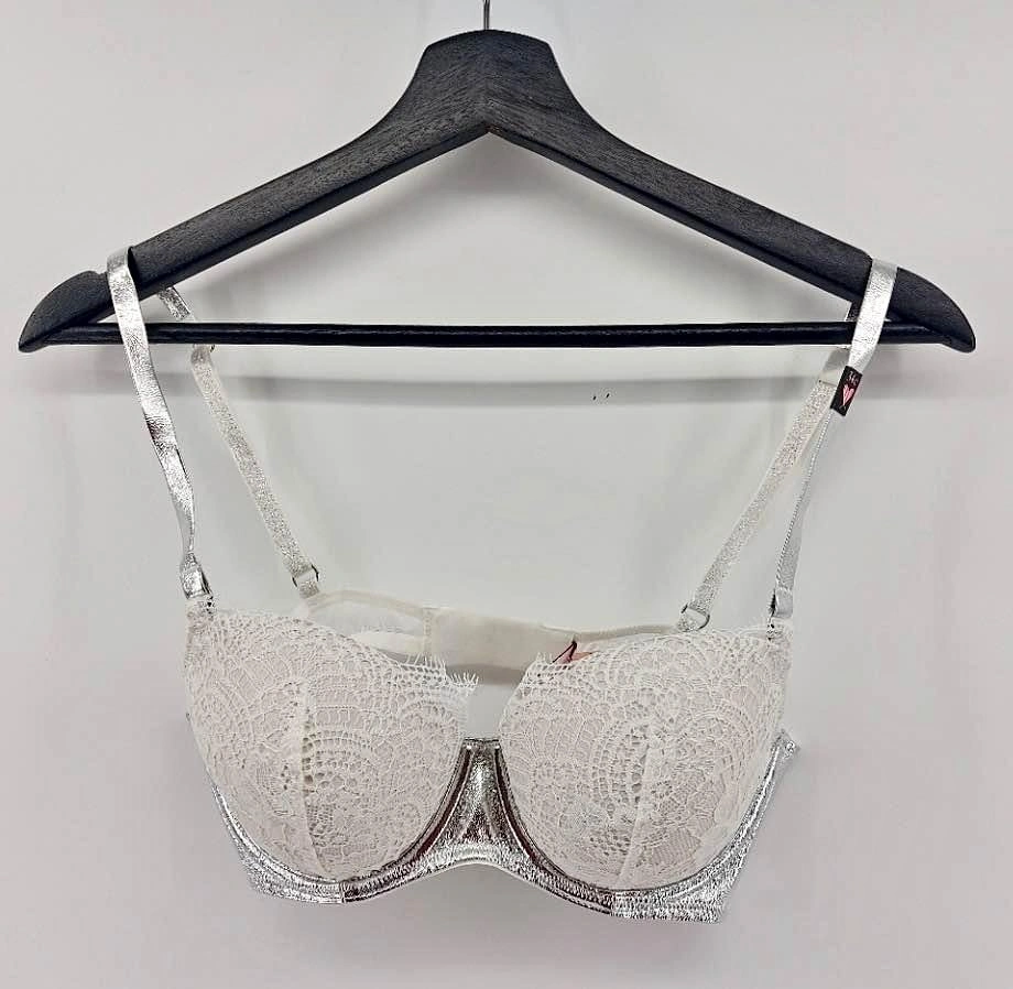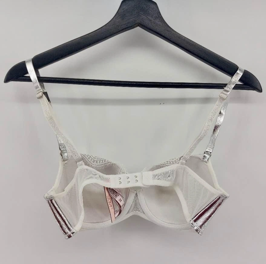 No longer available in stores, rare! White lace bra with silver straps and band. Lightly padded and underwired. Size 34C. Brand new with tags. Absolutely gorgeous.
