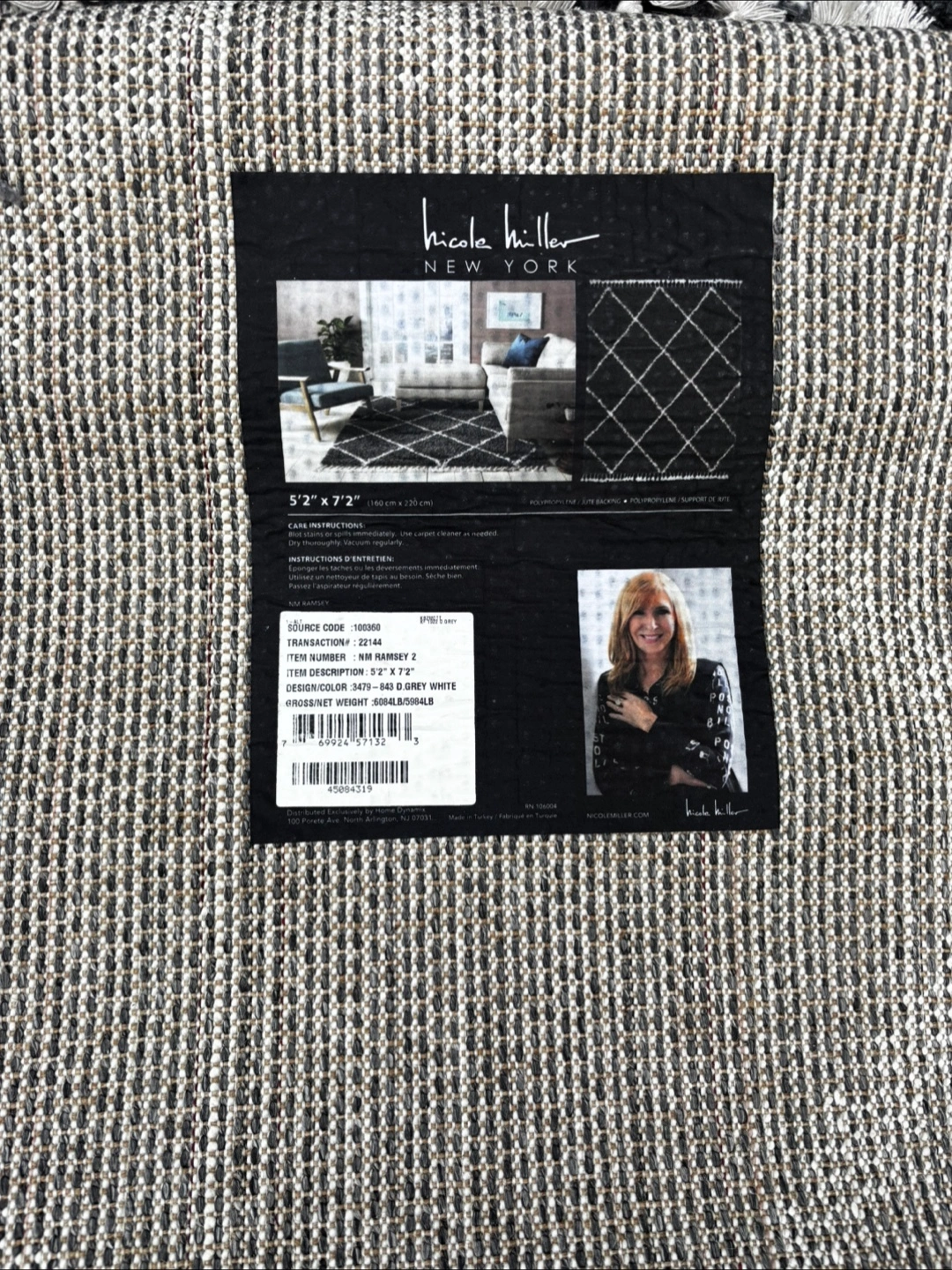 Selling a nicole miller NEW YORK rug. It's 5'2" x 7'2" (160 cm x 220 cm). The item description is RAMSEY 2 and the colour is listed as GREY WHITE.