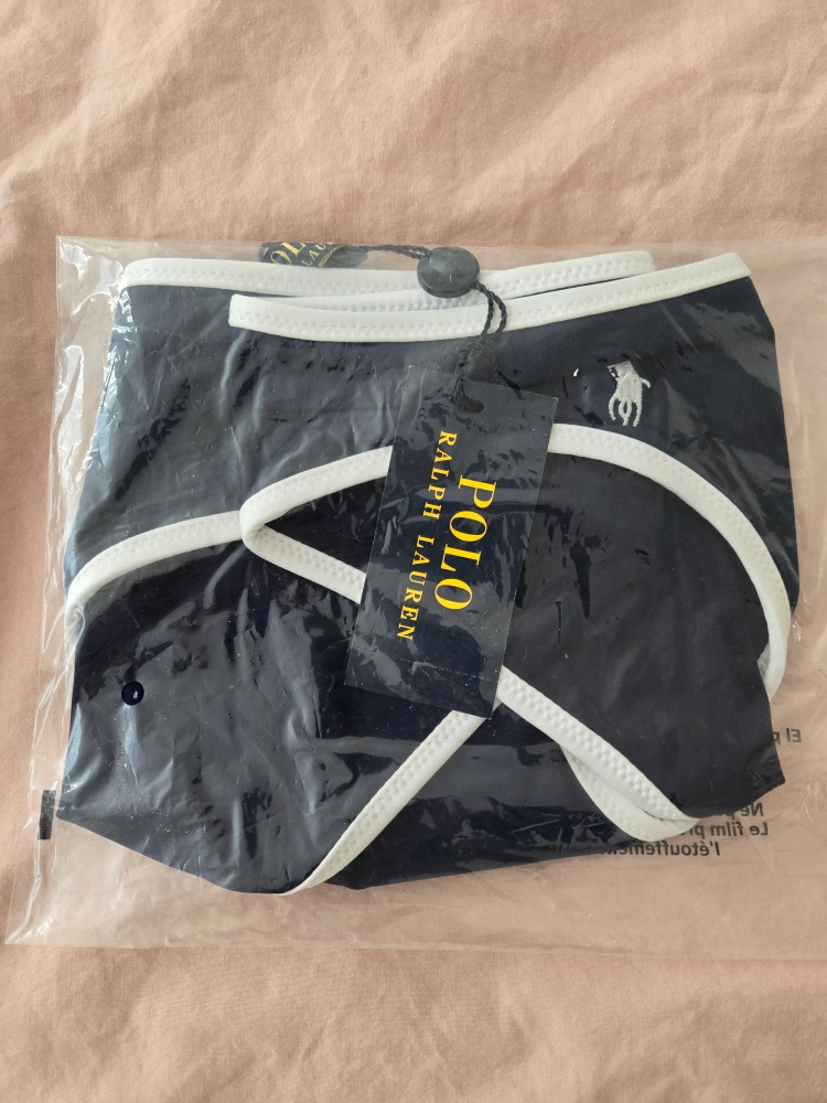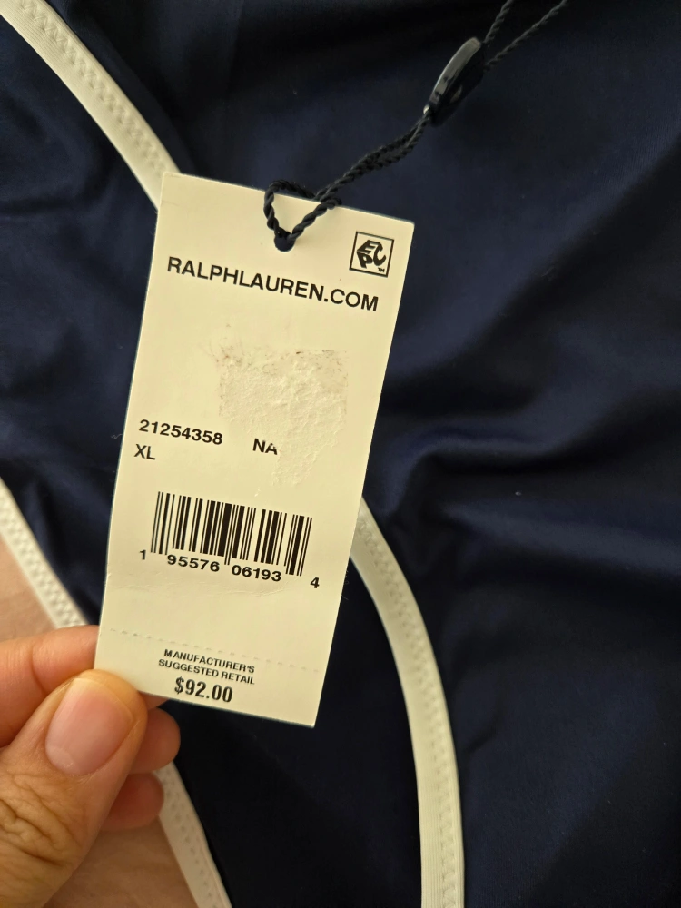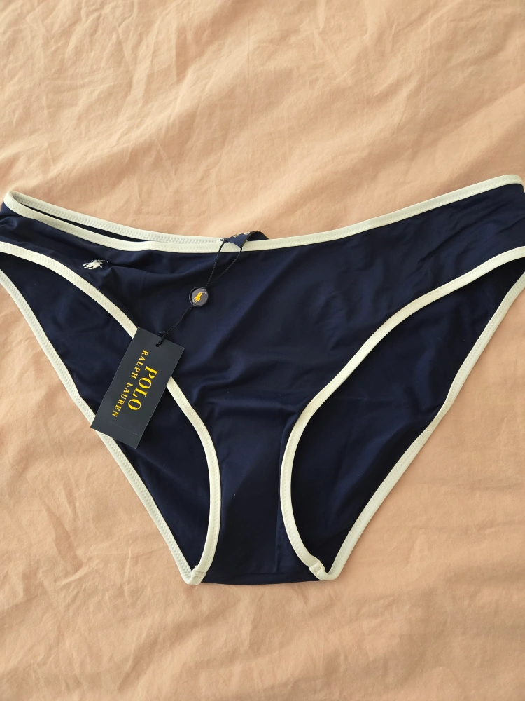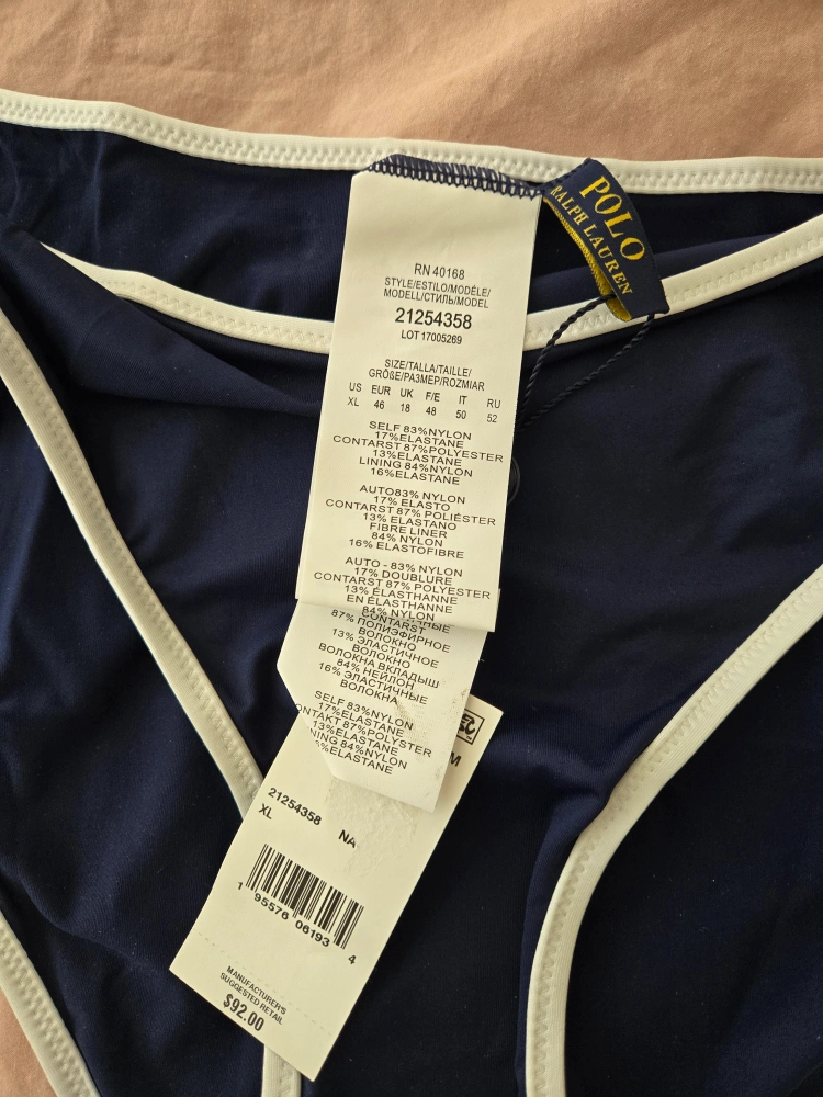 Here's a brand new Polo Ralph Lauren bikini bottom! It's a size XL and still in the original packaging with tags attached. The suggested retail price on the tag is $92.00. The main material is 83% nylon and 17% elastane, with an 84% nylon and 16% elastane lining