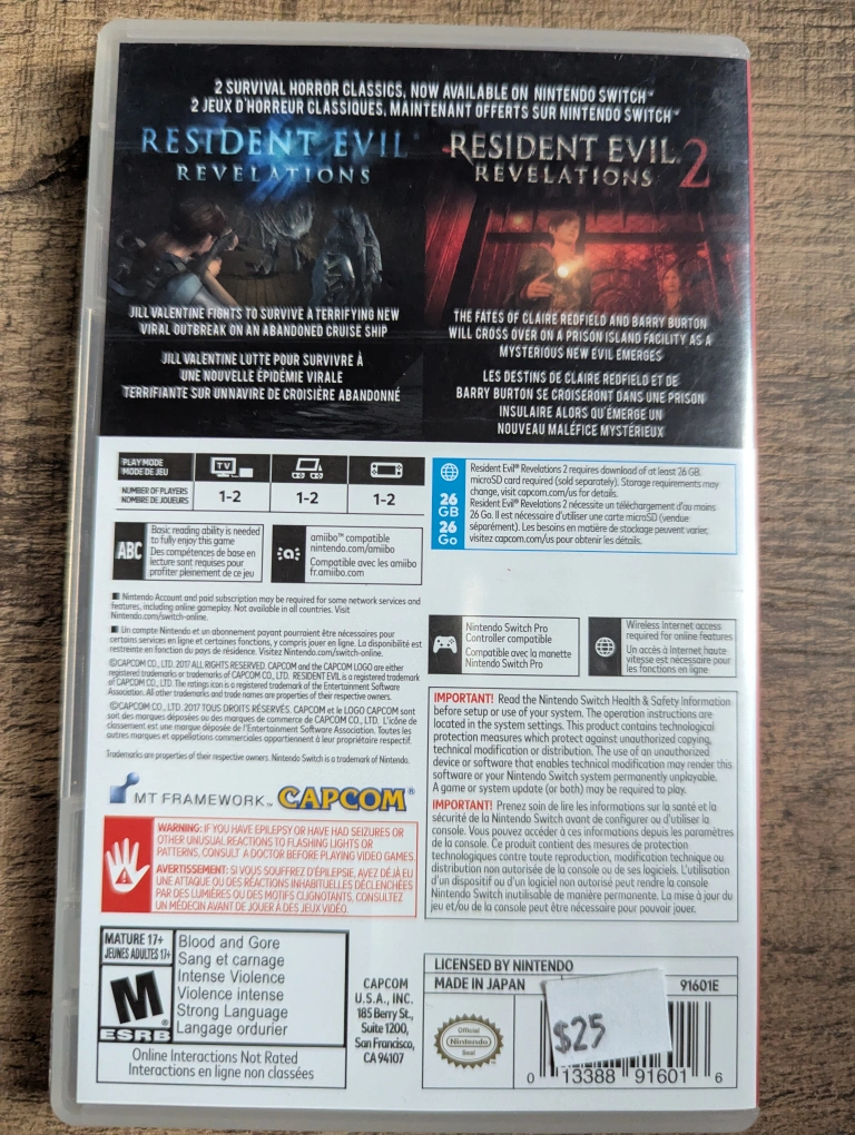 Nintendo switch Resident Evil revelations for sale. In great working condition. It's only Resident evil revelations 1st game and not revelations 2 as the code has been used. Selling for $25. Pick ups only