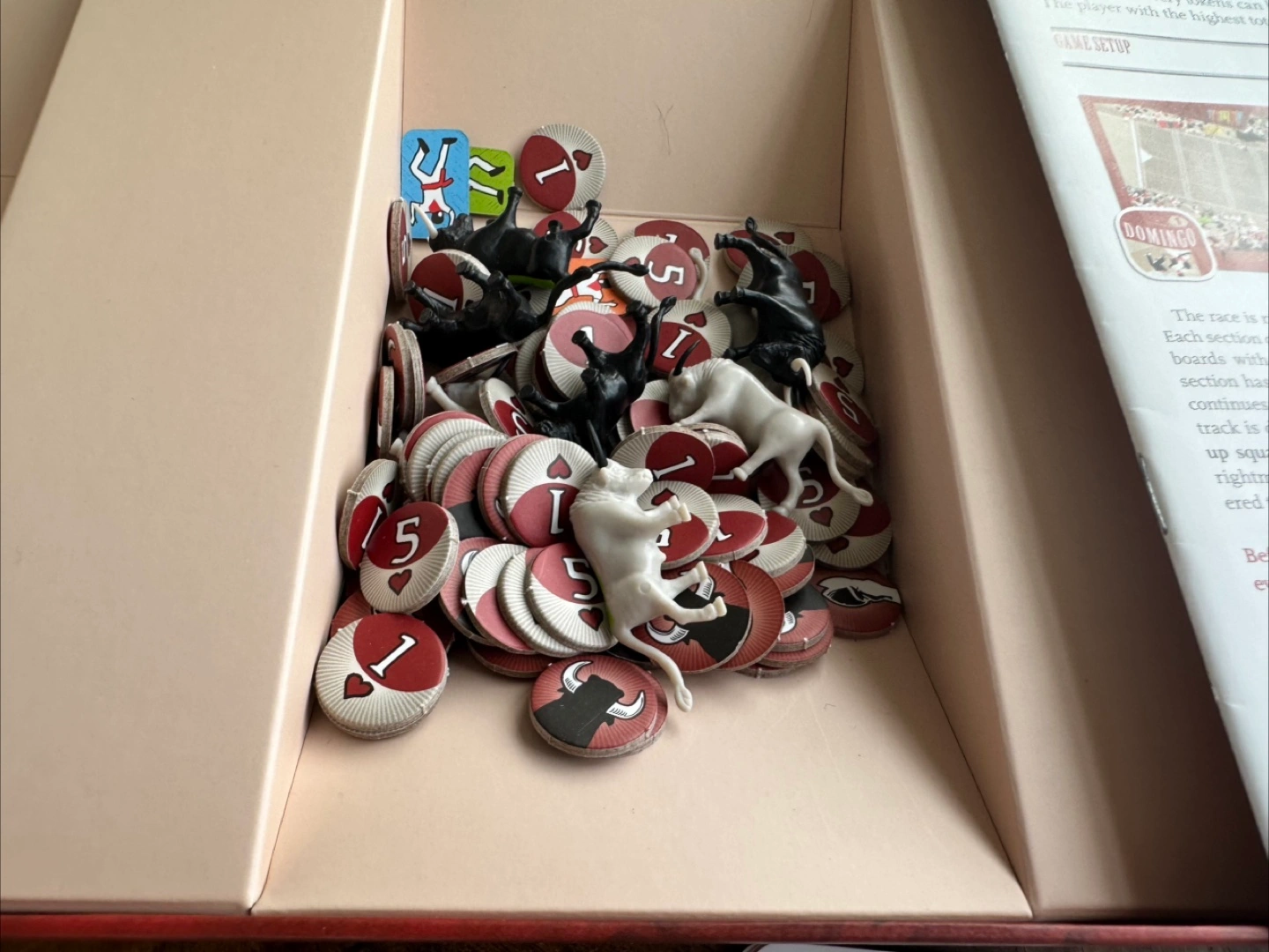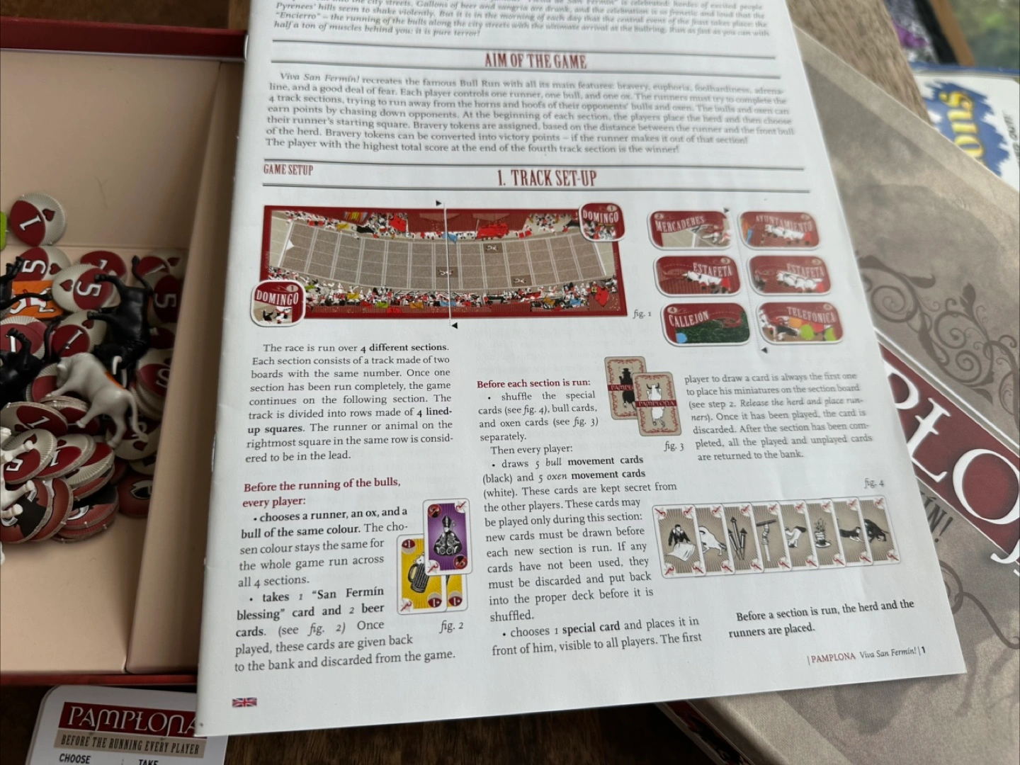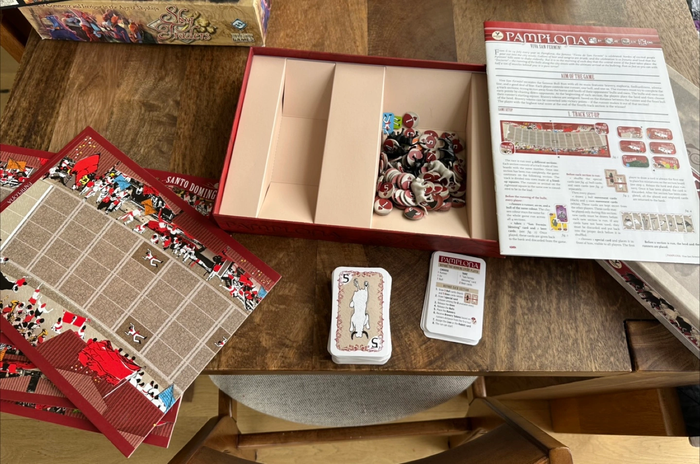 Selling a complete copy of the Pamplona Viva San Fermín! board game by Ghenos Games! This game recreates the famous Bull Run with all its bravery, euphoria, foolhardiness, adrenaline, and a good deal of fear. All components are included, and the box is in great shape. Get ready to try to complete the 4 track sections, trying to run away from the herds and hoofs of your opponent's bulls and oxen!
