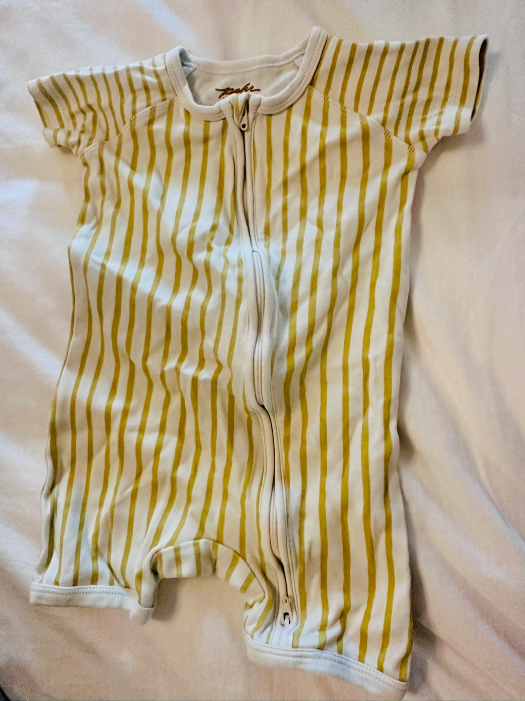 This adorable Pehr romper is in excellent condition! It features a cute striped pattern in white and yellow. Perfect for your little one aged 12-18 months (47 cm). Pet and smoke free home