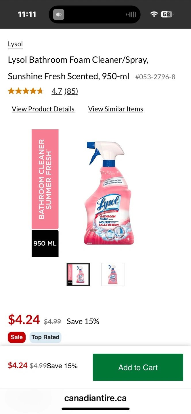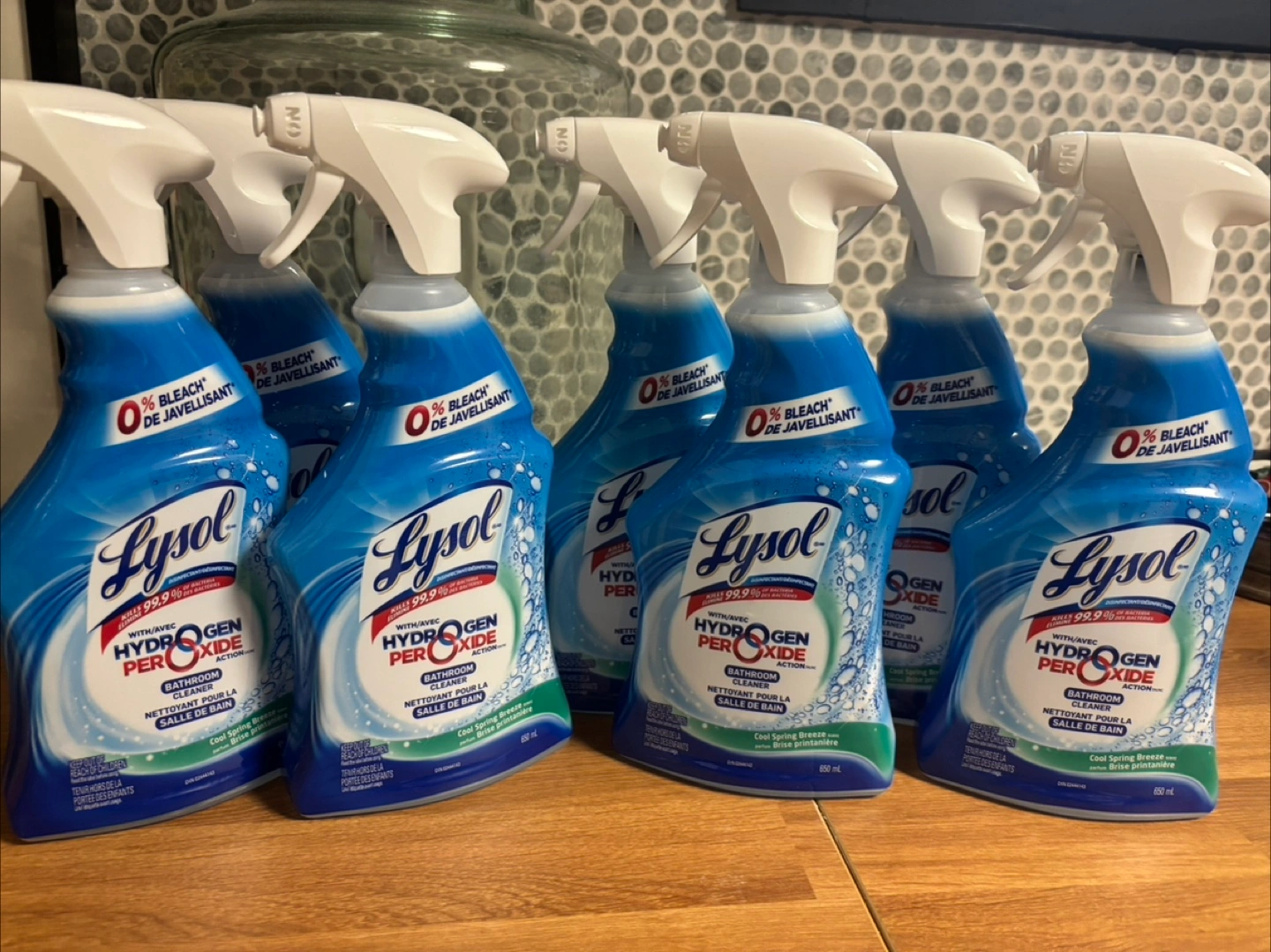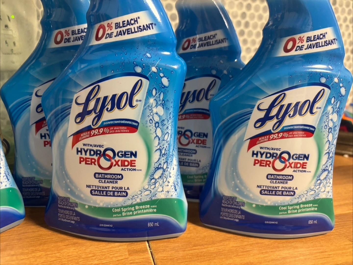 I have some Lysol bathroom cleaner bottles for sale. They are the Cool Spring Breeze scent and come in 650 mL bottles. They disinfect and kill 99.9% of viruses and bacteria with hydrogen peroxide action. Price for all