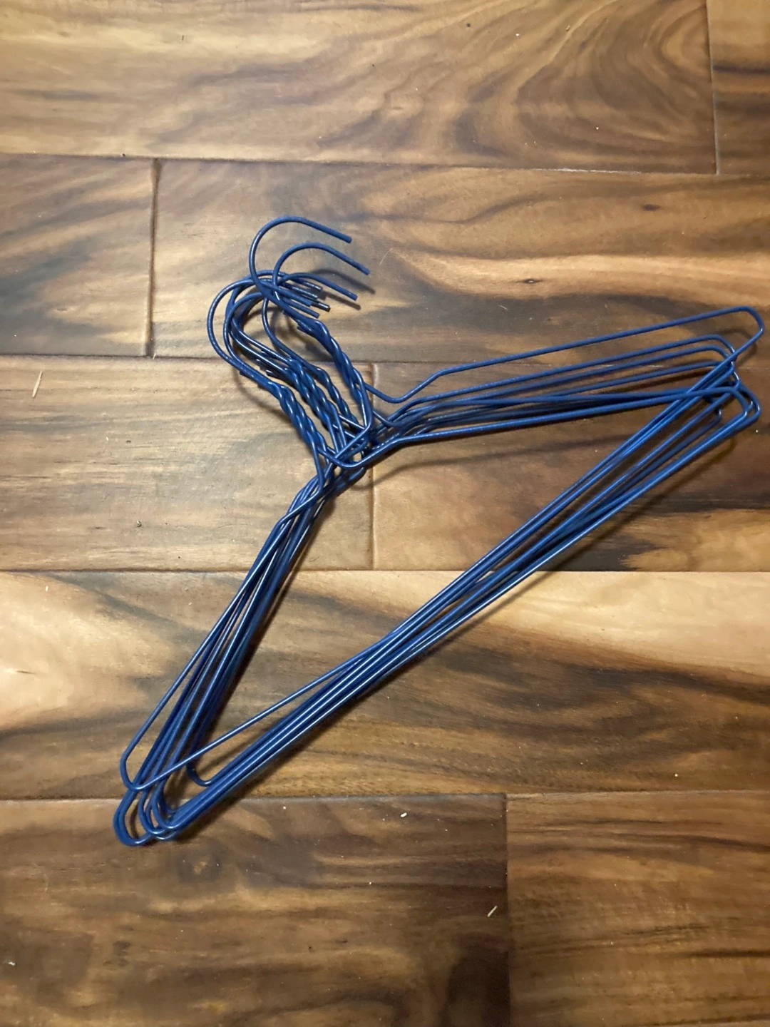 Selling a set of 7 blue metal clothes hangers! They're sturdy and ready to help organize your closet.
