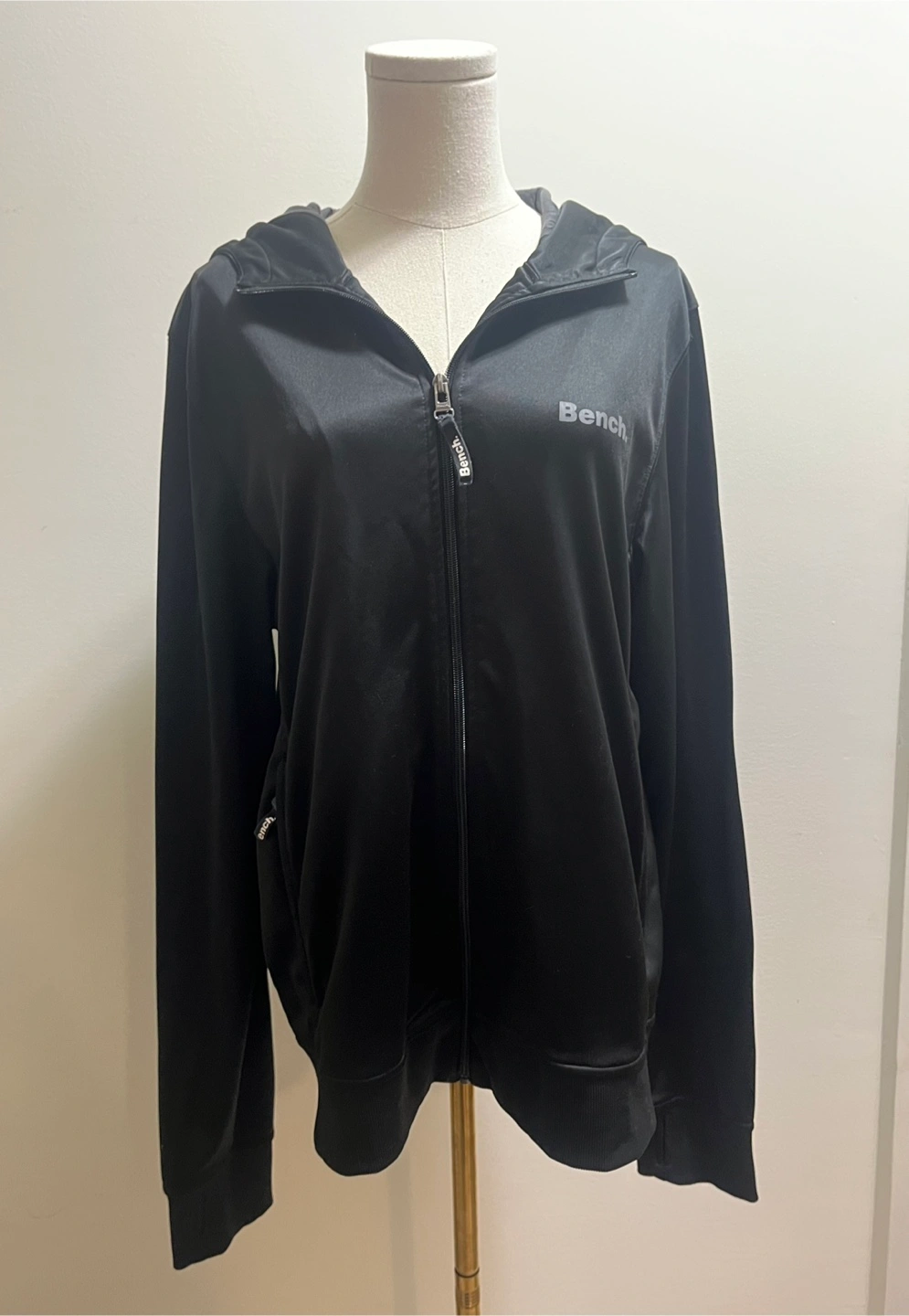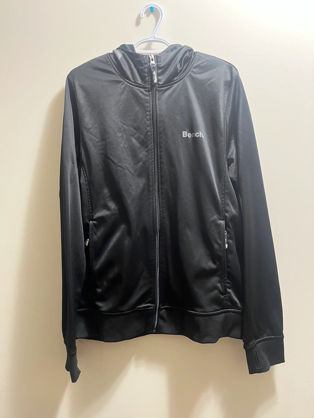 Excellent condition Pickup Brampton or downtown Toronto Black zip up hoodie Has 2 pockets Hood has BENCH written on it Chic and versatile black jacket by Bench. Features a full-zip front and hood. Ideal for everyday wear. Material: Body: 100% polyester Hood lining: 100% cotton Ribbed edges: 95% polyester 5% elastane