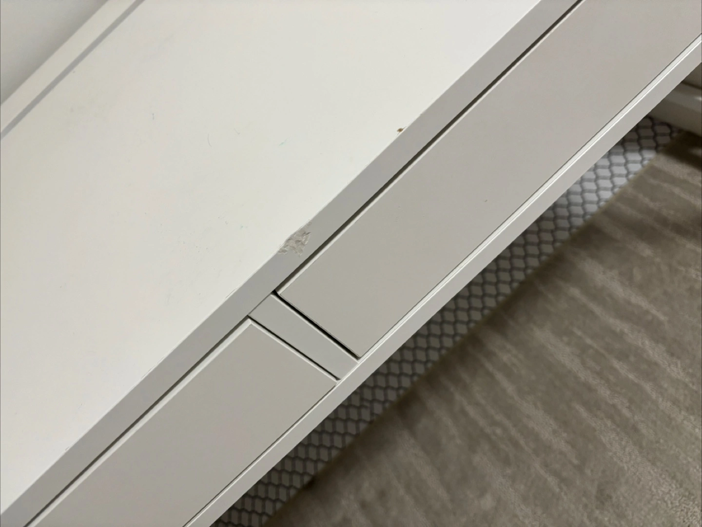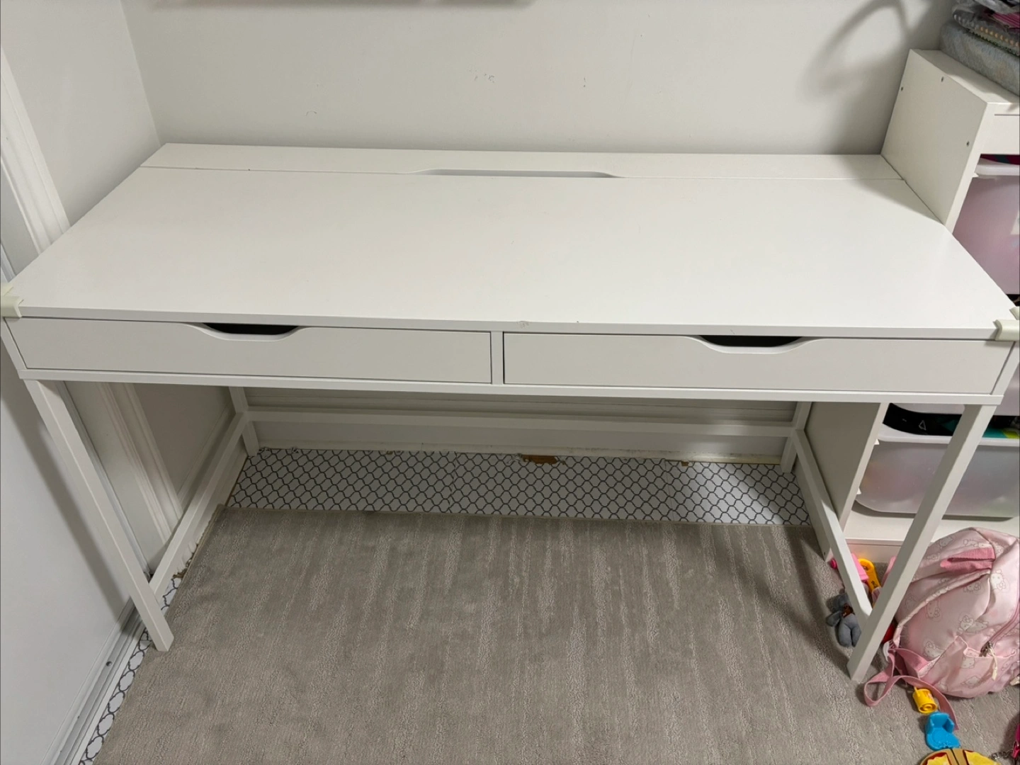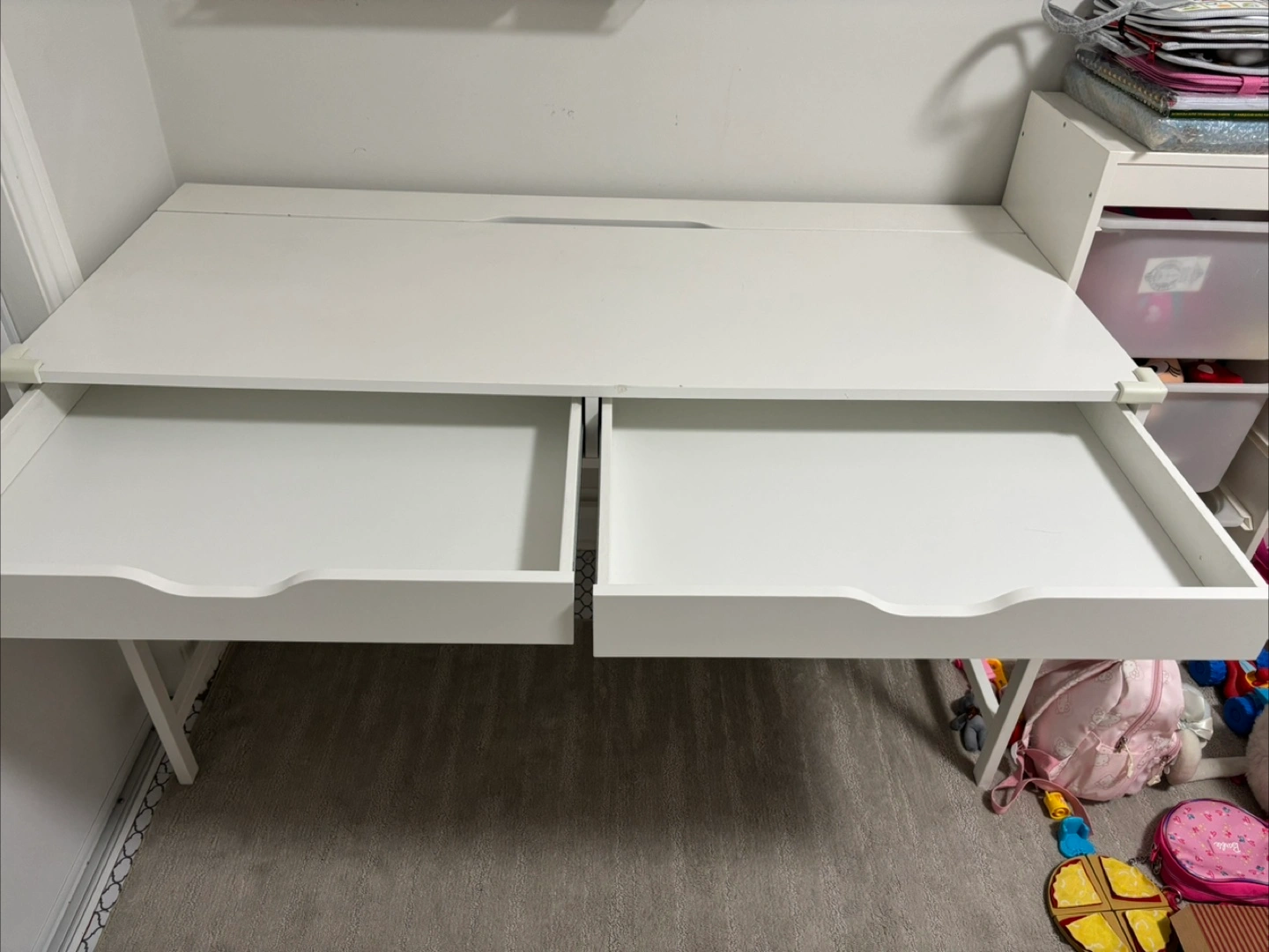 Selling a white desk that's perfect for a home office or study space! It features built-in drawers for storage, helping to keep your area tidy. There are some signs of use, such as minor scratches, but it's still in good condition and fully functional