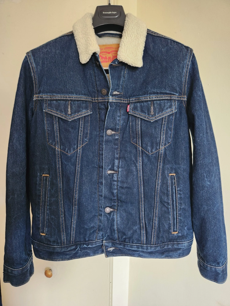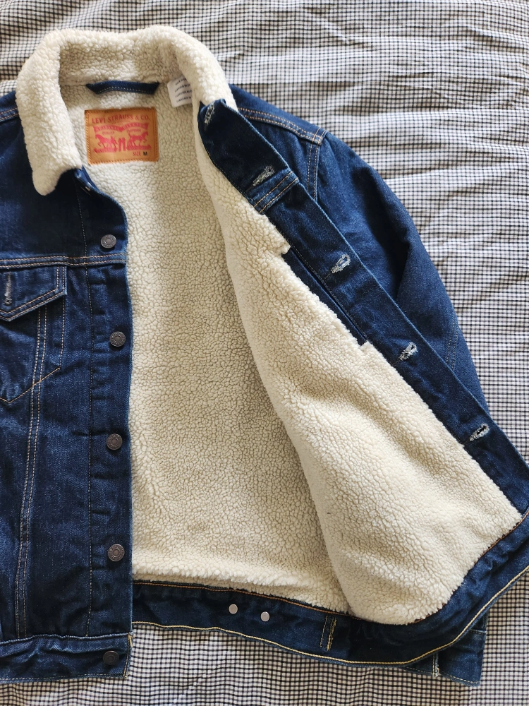 Levi's Sherpa Trucker Jacket in size medium. This classic denim jacket features a cozy sherpa lining and collar, perfect for cooler fall weather. It's in great condition and ready for a new home! *I'm willing to trade it for the same jacket in Large size and in dark wash.