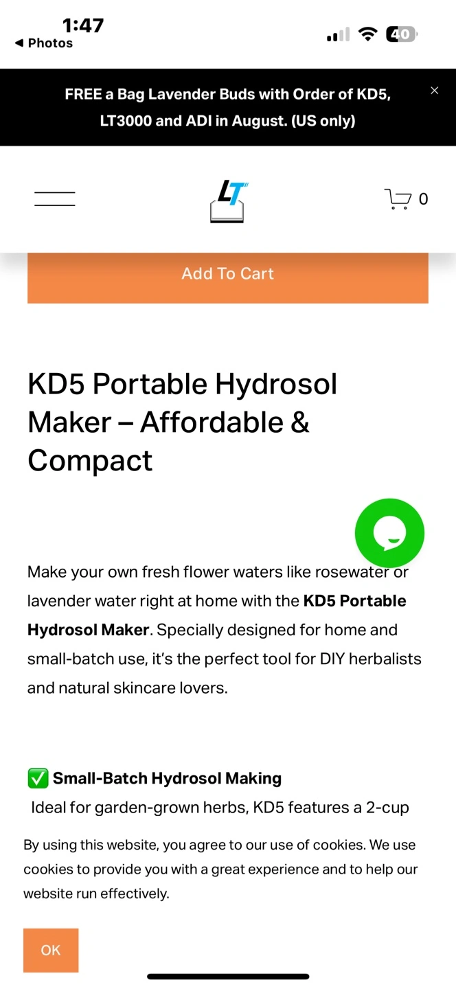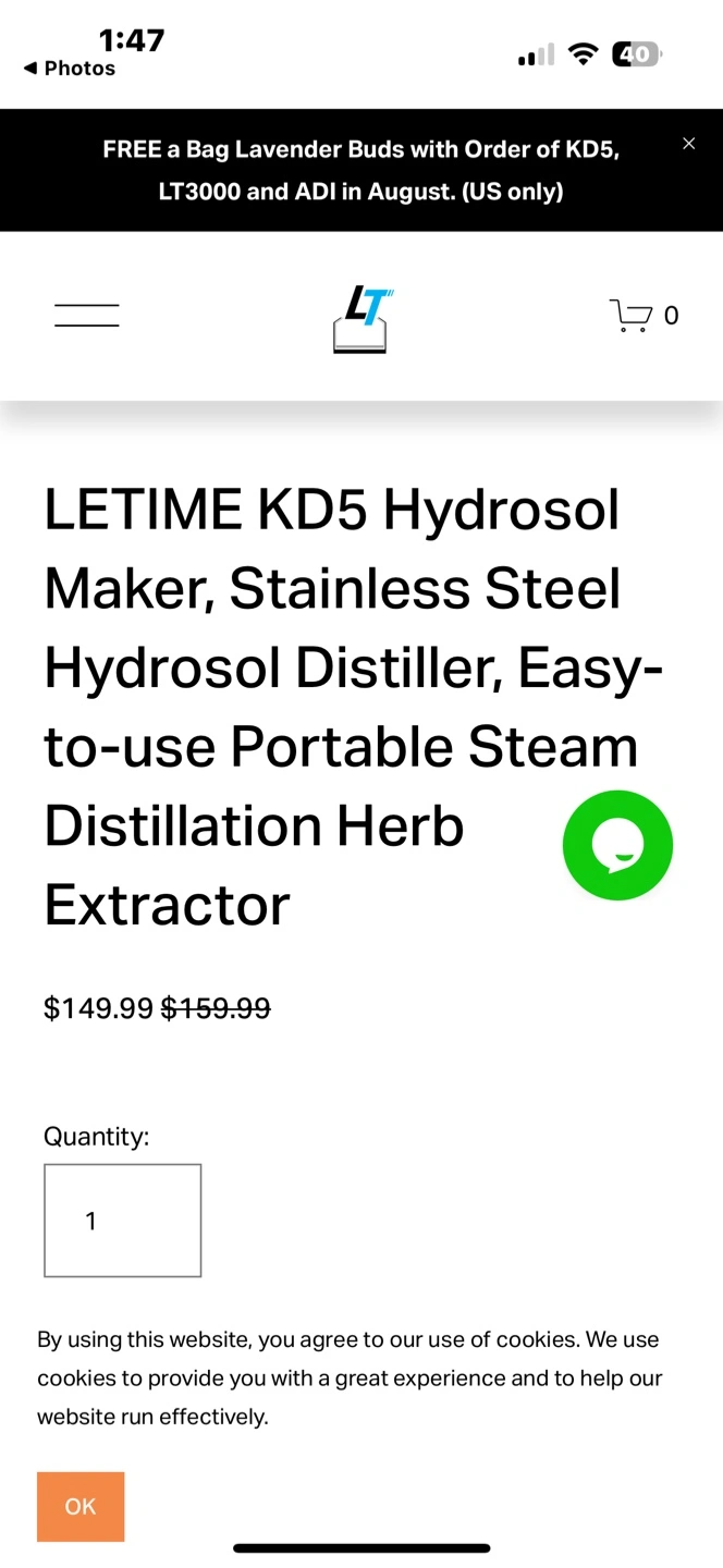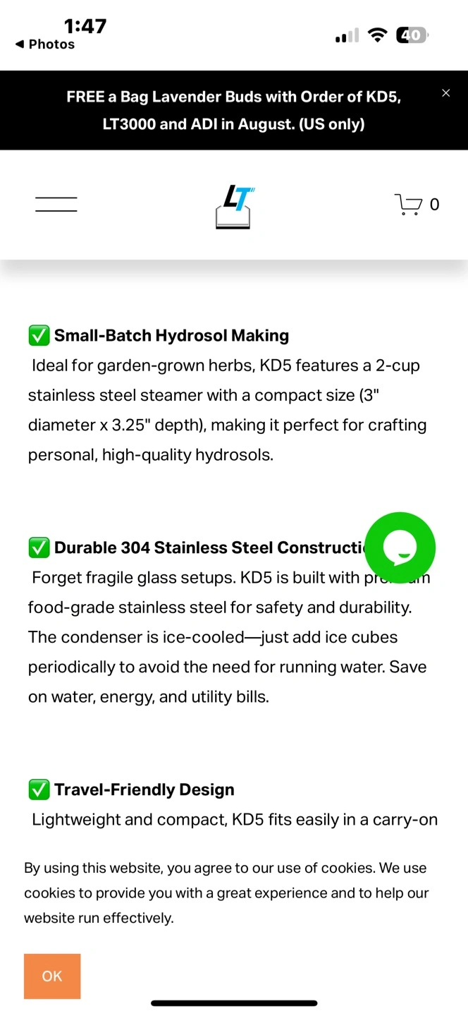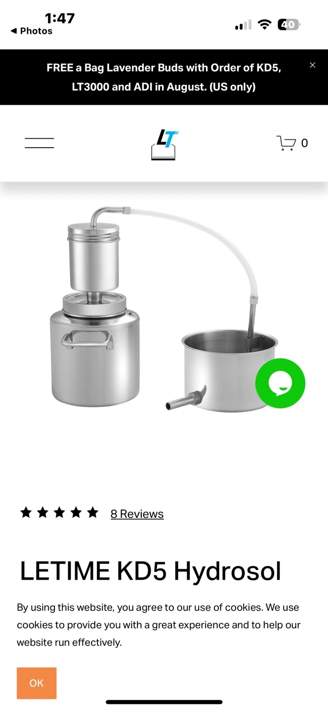 I'm selling a LETIME KD5 Hydrosol Maker. It's a stainless steel hydrosol distiller that's easy to use and portable. It's ideal for small-batch hydrosol making with a 2-cup stainless steel steamer. The compact size (3" diameter x 3.25" depth) makes it perfect for crafting personal, high-quality hydrosols. It's made with durable 304 stainless steel construction for safety and durability and is lightweight and compact, fitting easily in a carry-on New sealed in box Pick up NE Marlborough See my other ads
