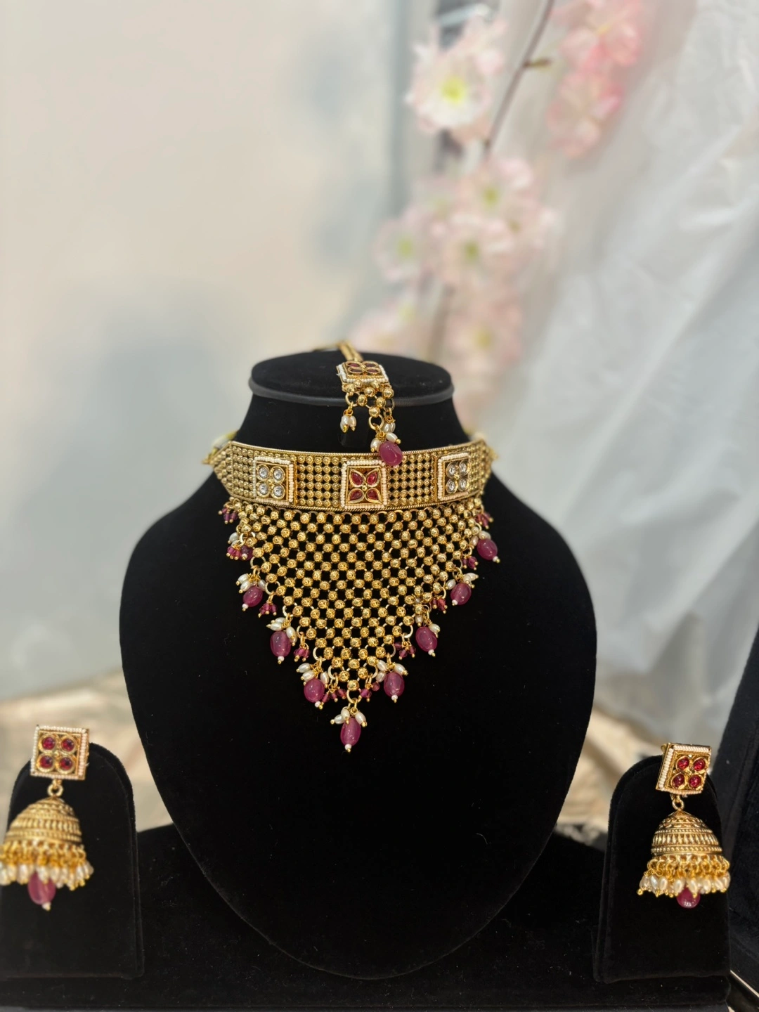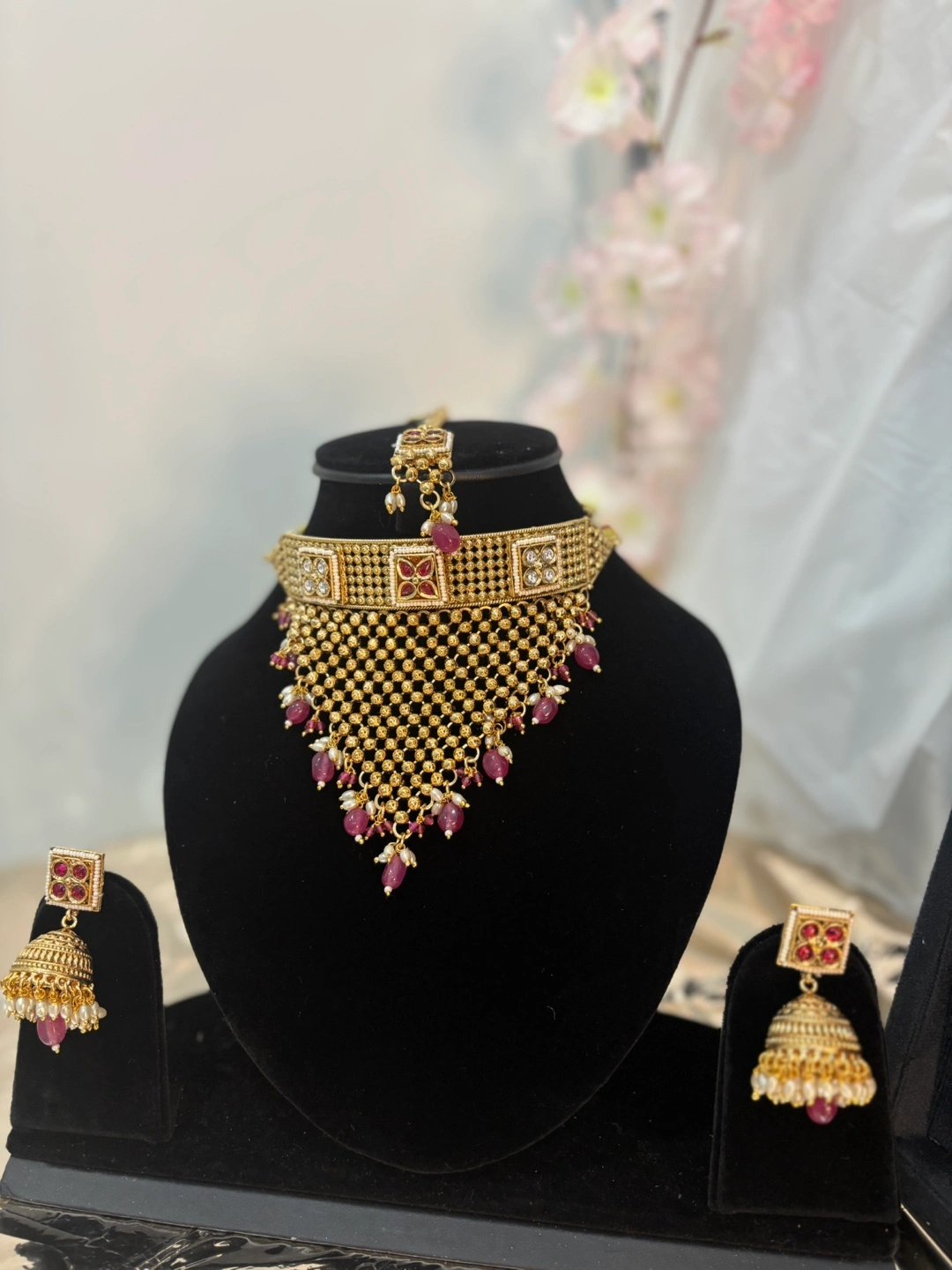 Beautiful gold-plated Indian jewelry set, perfect for adding a touch of elegance to any outfit! This set includes a necklace, earrings, and a headpiece. The intricate design and ruby accents make it a stunning addition to your collection