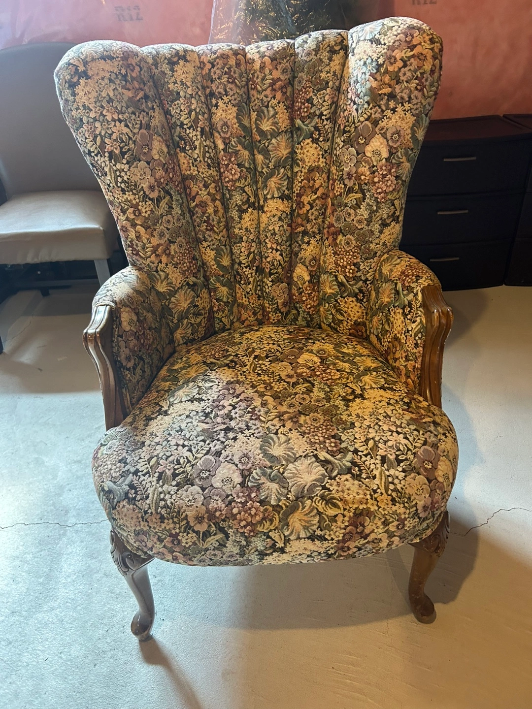 Selling a beautiful floral wingback chair! It's in great shape and would look lovely in any living space. The fabric is a detailed floral pattern with a classic wingback design and carved wooden legs. It's a comfortable and stylish accent piece for your home