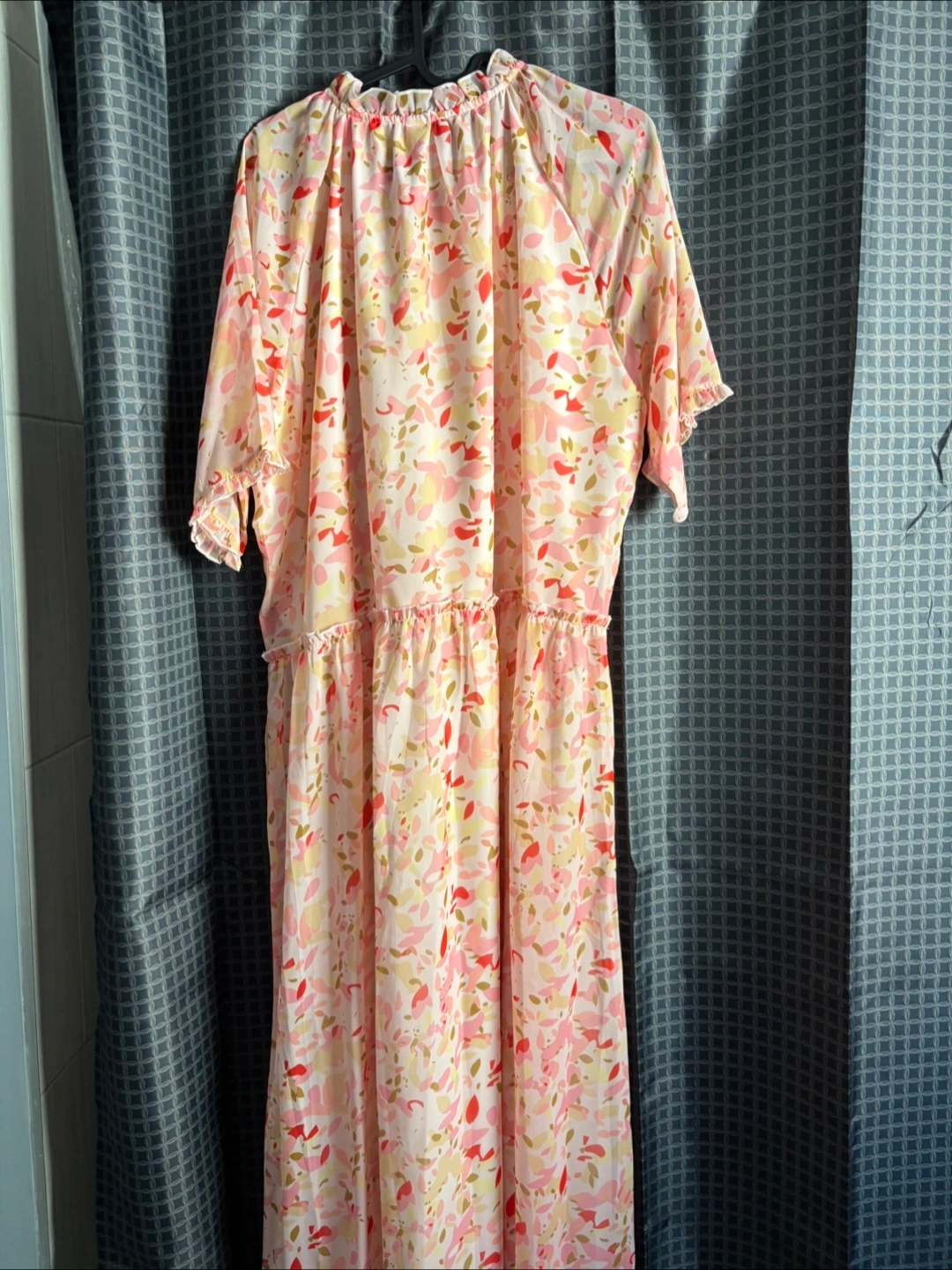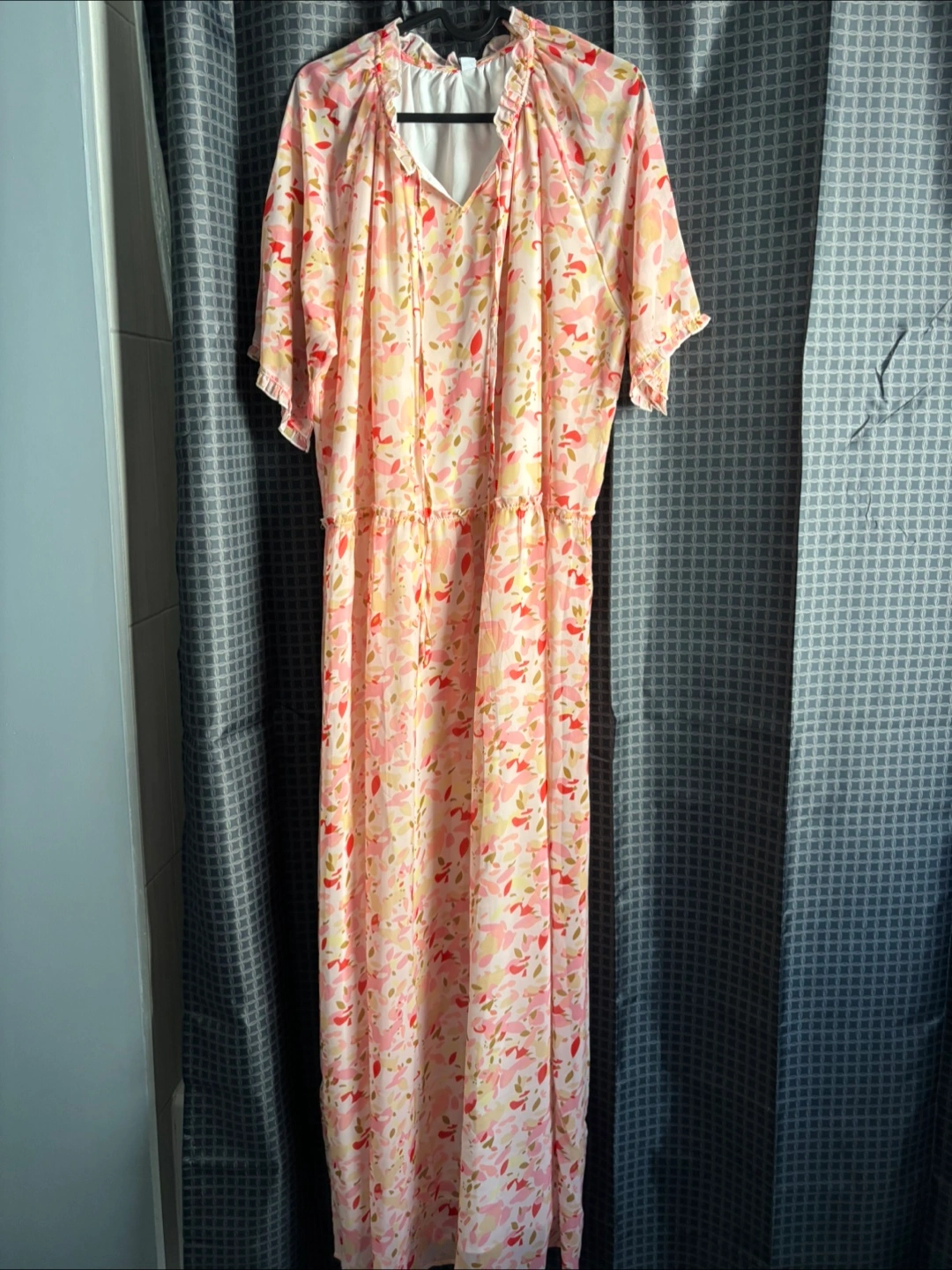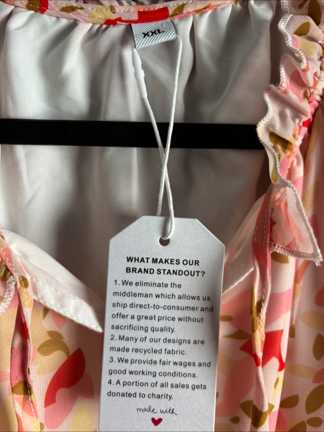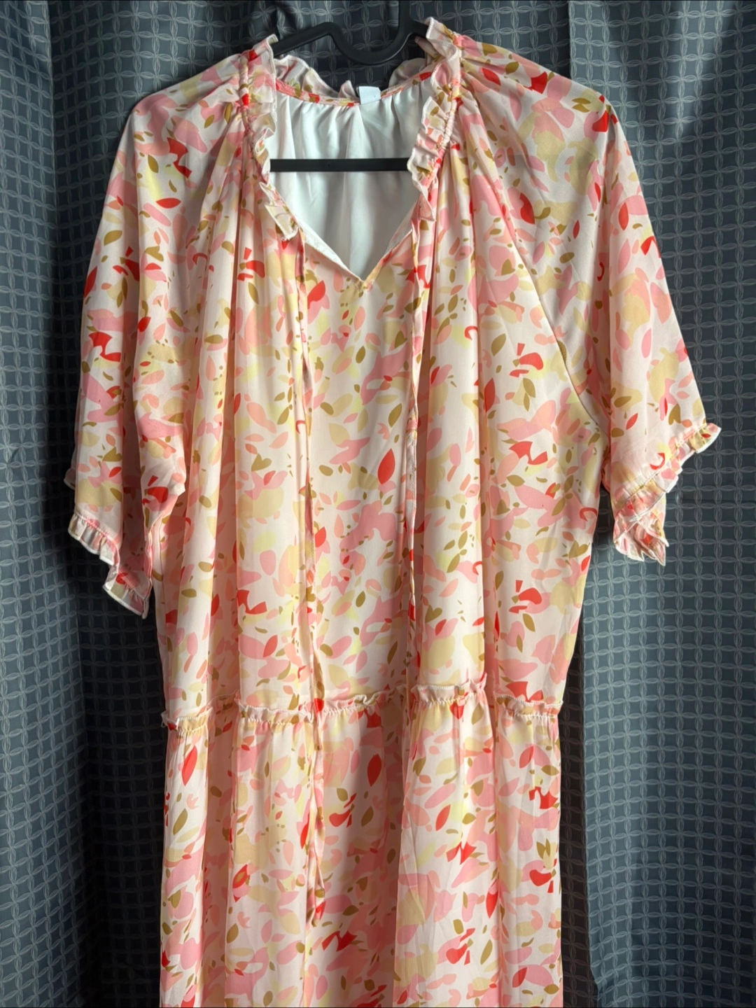 This is a pretty floral print dress! It's a size XXL(fits small more like xl) and features a lightweight material with a white lining. Perfect for a sunny day out or a casual event
