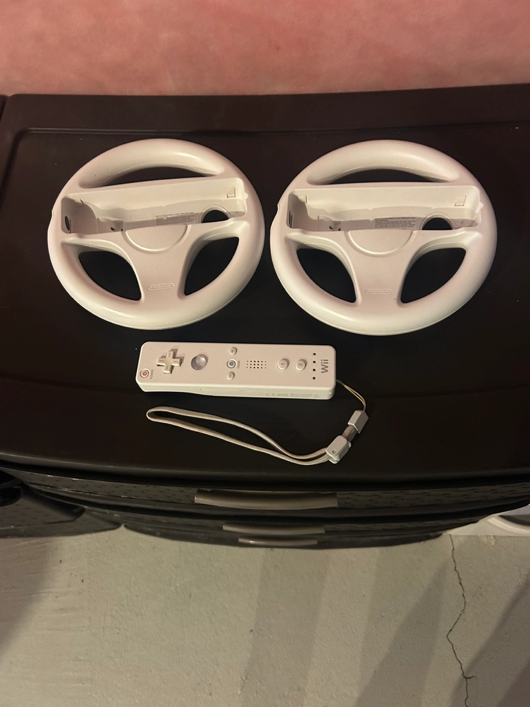 Selling two Nintendo Wii steering wheels and a Wii remote. Perfect for Mario Kart or other racing games on the Wii! They're in great shape and ready for a new home.