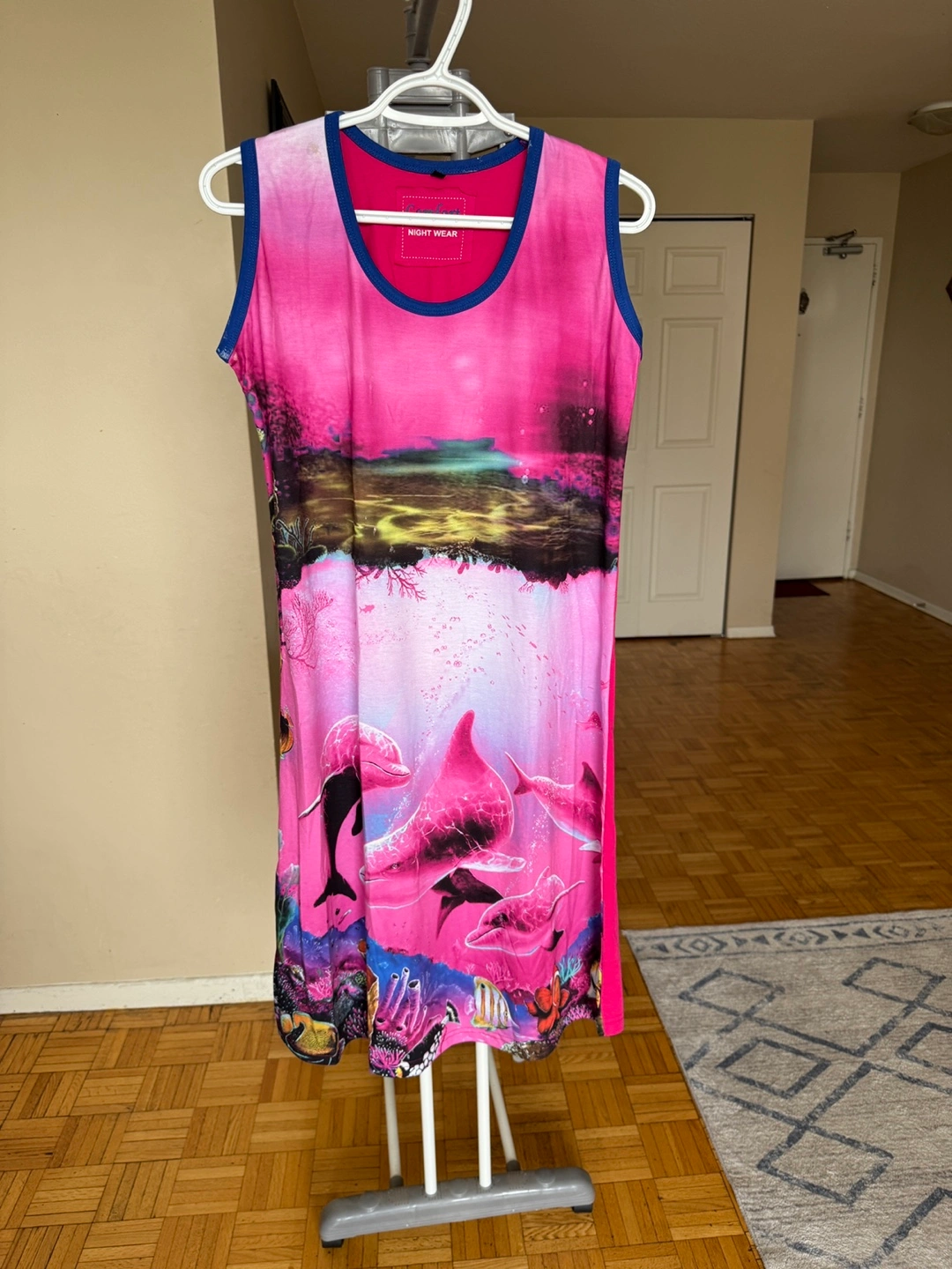 Cute and comfy Night Wear dress with a fun pink dolphin print! Perfect for lounging around the house or a casual day out. It's in great condition and ready for a new home .Pickup at 1900 bloor street L4X2S1