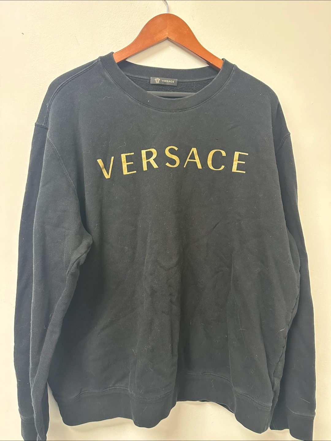 Selling a Versace crewneck sweatshirt in black with gold lettering. It's a stylish piece with the Versace logo prominently displayed on the front and a Medusa head design on the back. Great for adding a touch of luxury to your wardrobe!