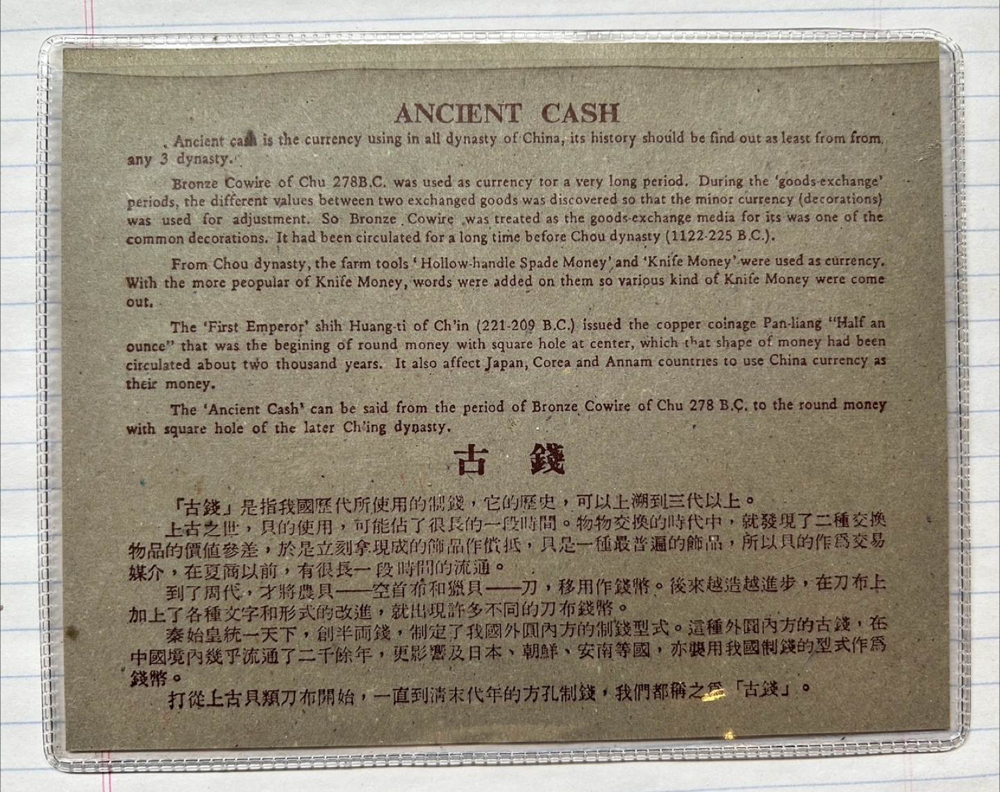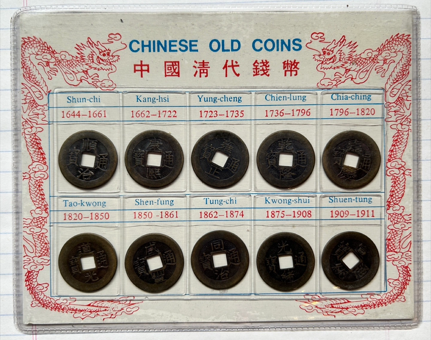 Replica set of old Chinese coins from the Qing Dynasty. Includes coins from the Shun-chi, Kang-hsi, Yung-cheng, Chien-lung, and Chia-ching periods (1644-1820), as well as Tao-kwong, Shen-fung, Tung-chi, Kwong-shui, and Shuen-tung periods (1820-1911).