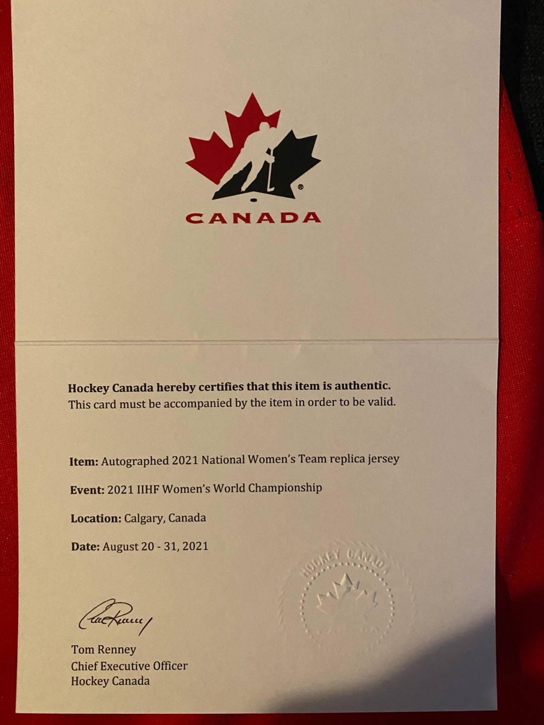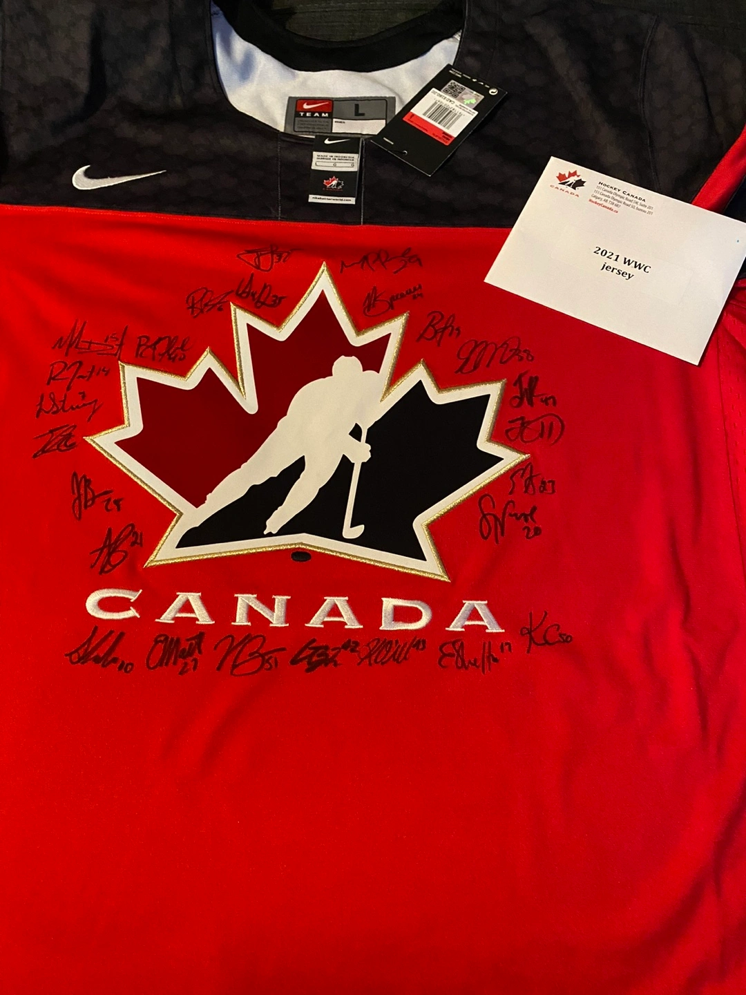 Selling an autographed Nike Hockey Canada jersey from the 2021 IIHF Women's World Championship! It's a replica jersey, size L. A Hockey Canada certificate of authenticity is included, so you know it's the real deal! Perfect for any hockey fan!