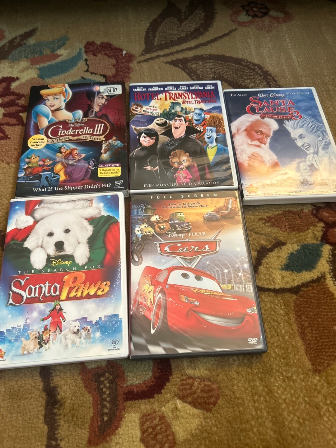 Selling a collection of Disney DVDs! Includes: $3 each - Cinderella III: A Twist in Time (Version française incluse) - Hotel Transylvania - The Santa Clause 3: The Escape Clause - The Search for Santa Paws - Cars (Full Screen) Perfect for family movie nights!